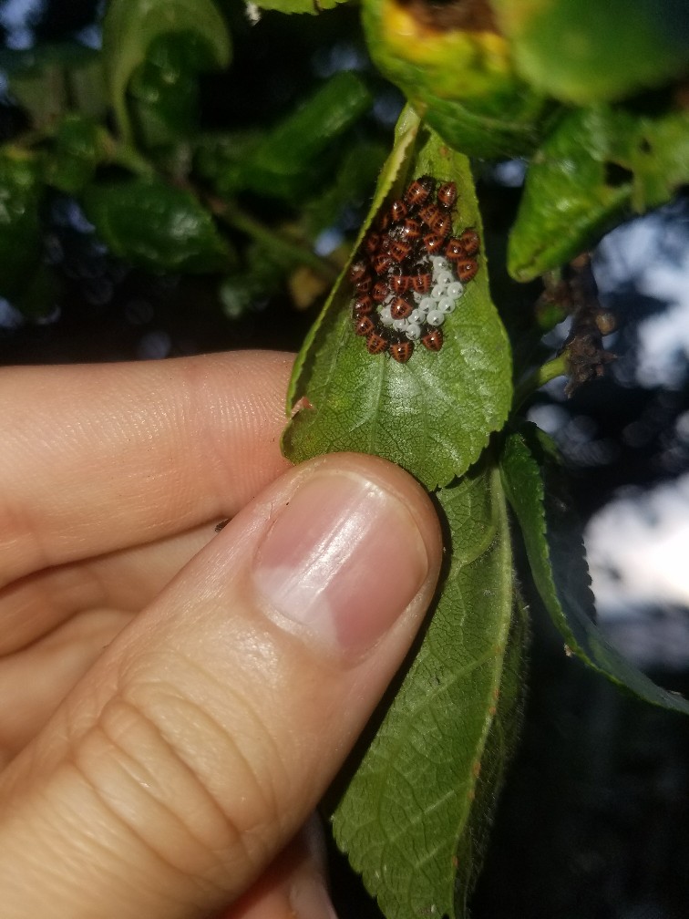 Quelqu'un a une idée du nom de ces insectes qui ressemblent à des coccinelles ? En blanc ce sont des oeufs j'imagine ?