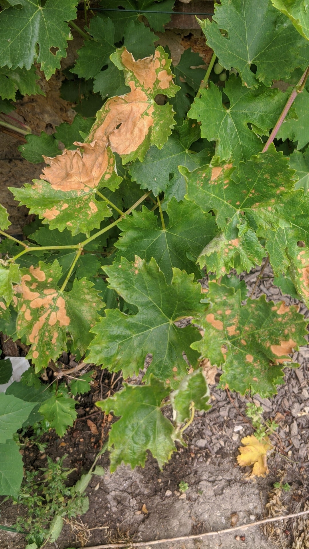 J'ai observé depuis quelques temps des tâches brunes qui s'agrandissent et se propagent sur les feuilles de ma vigne. De ce que j'ai vu sur internet il semblerait que ce soit du Black rot mais je n'en suis pas certain. Est ce bien ça ? Que faire ? Sur mon autre vigne j'ai aussi remarqué la présence de tâches mais celles ci semblent pas être du même type. Pouvez vous m'aider ? Merci pour votre aide