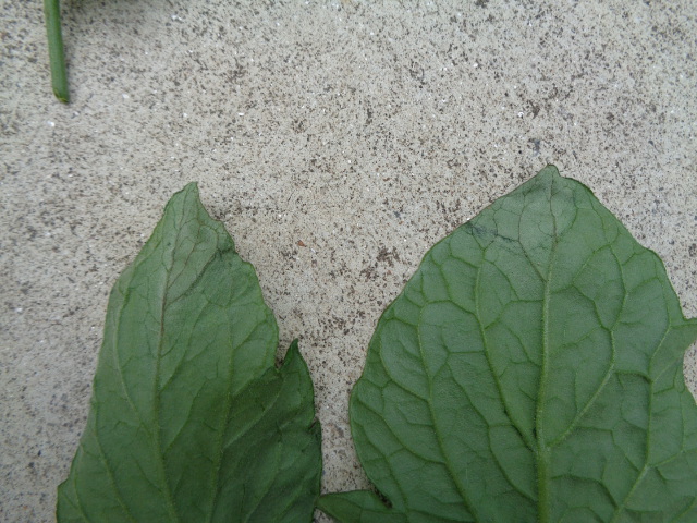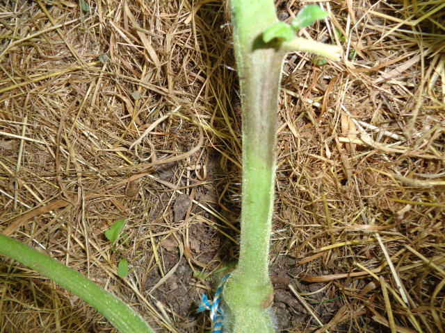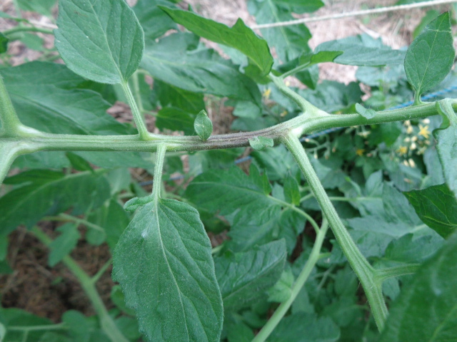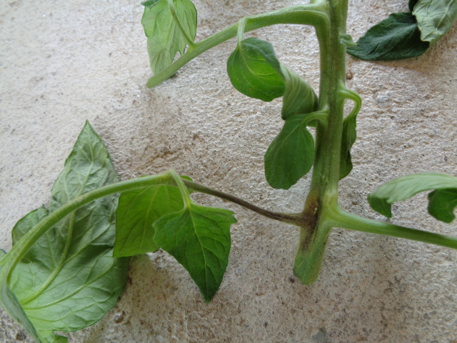 rebonjour, depuis le 15 juillet, j'ai vu d'autres traces noires essentiellement sur des tiges secondaires du coup, j'ai coupé à chaque fois et appliqué sur la plaie du bicarbonate + huile essentielle de romarin à cinéole + argile verte en tant que mouillant. je me suis demandée parfois si c'était bien du mildiou comme dans les deux cas ci dessous :