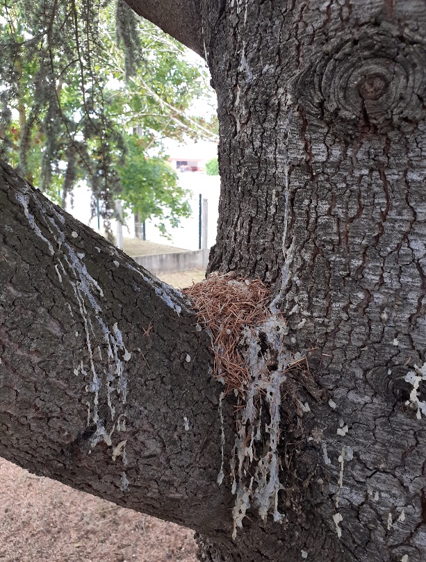 le cèdre : transpire ou suinte depuis un an, ca a commencé l'été dernier, on ne pouvait pas passer dessous sans avoir de la sève dans les cheveux, sur les vêtements... et ça a continué depuis mais un peu moins impressionnant. Pourtant il continue de pousser, pas mal de jeunes épines bien visibles.