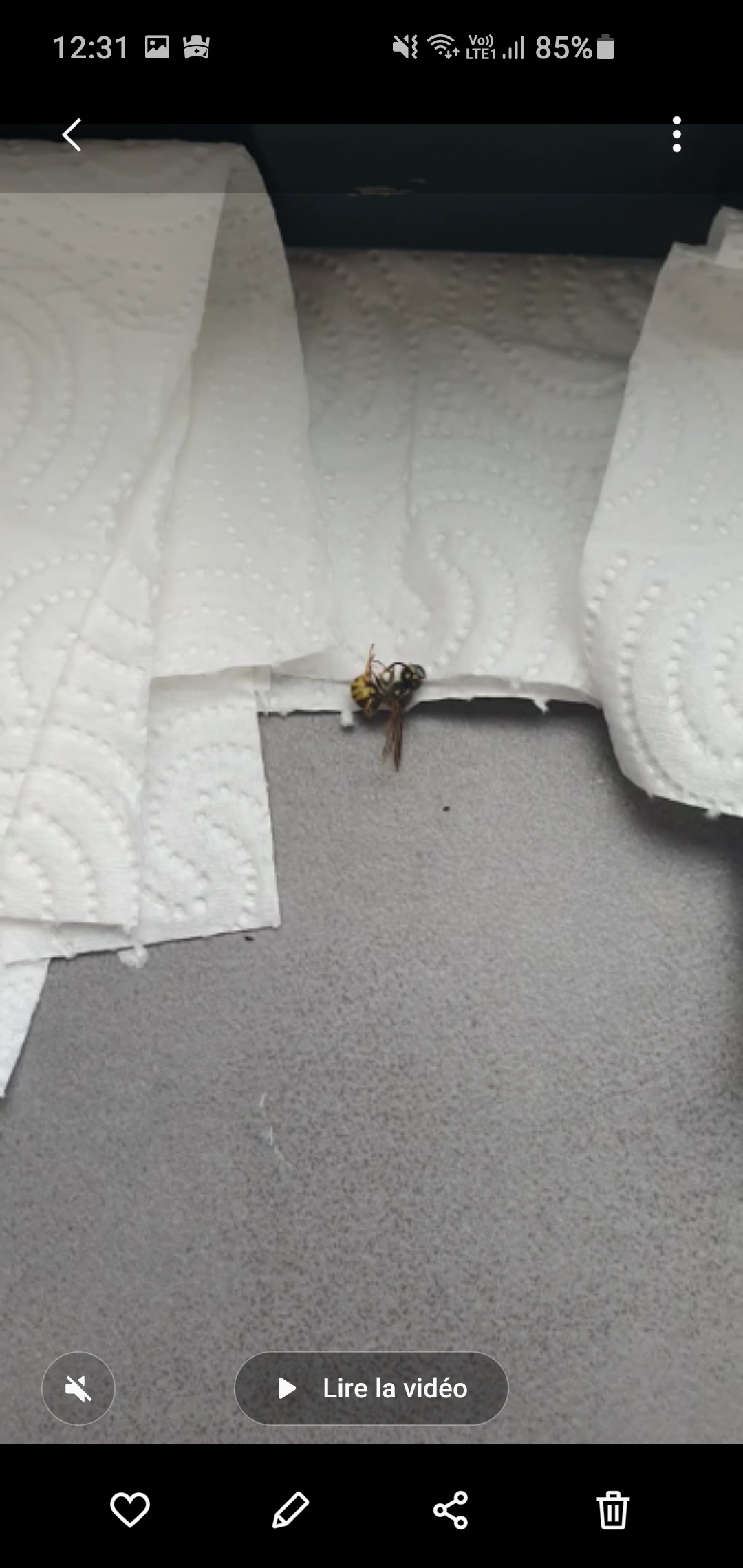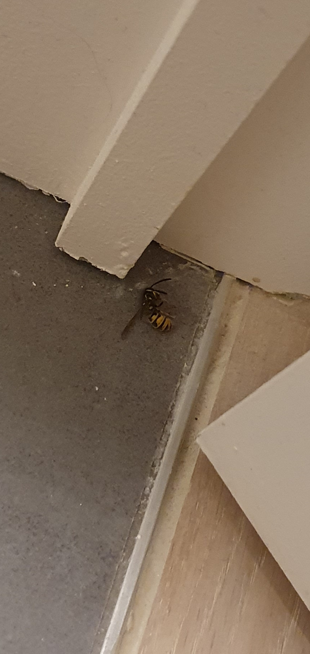 . Après, quand je suis aller au salon, j'ai vu au moins 5 guêpes aux fenêtres. Je suis retourné dans le hall et la à nouveau 2 guêpes, une que j'ai tué, l'autre est partie au salon et est entrée dans le socle d'un spot accroché au plafond.