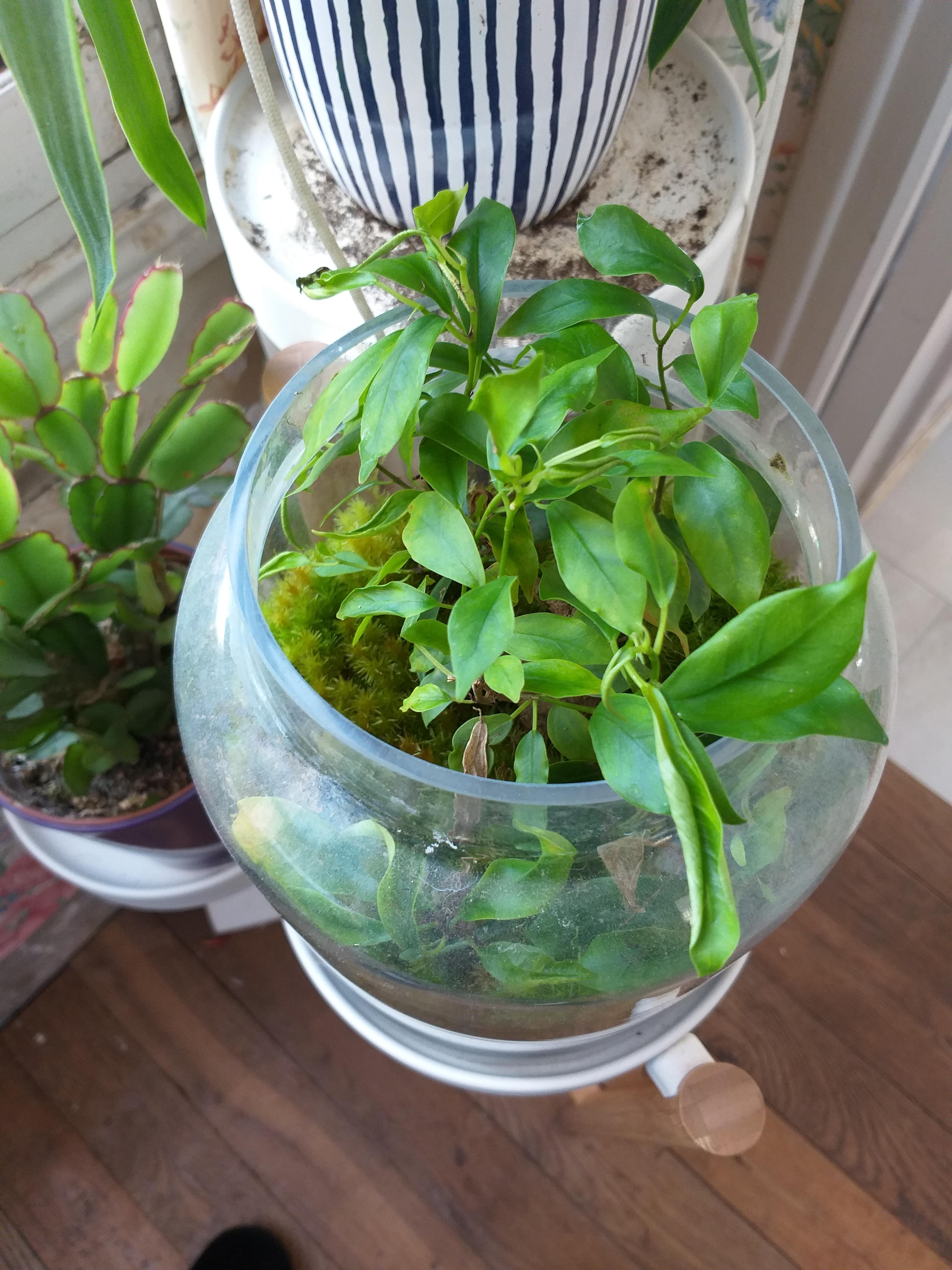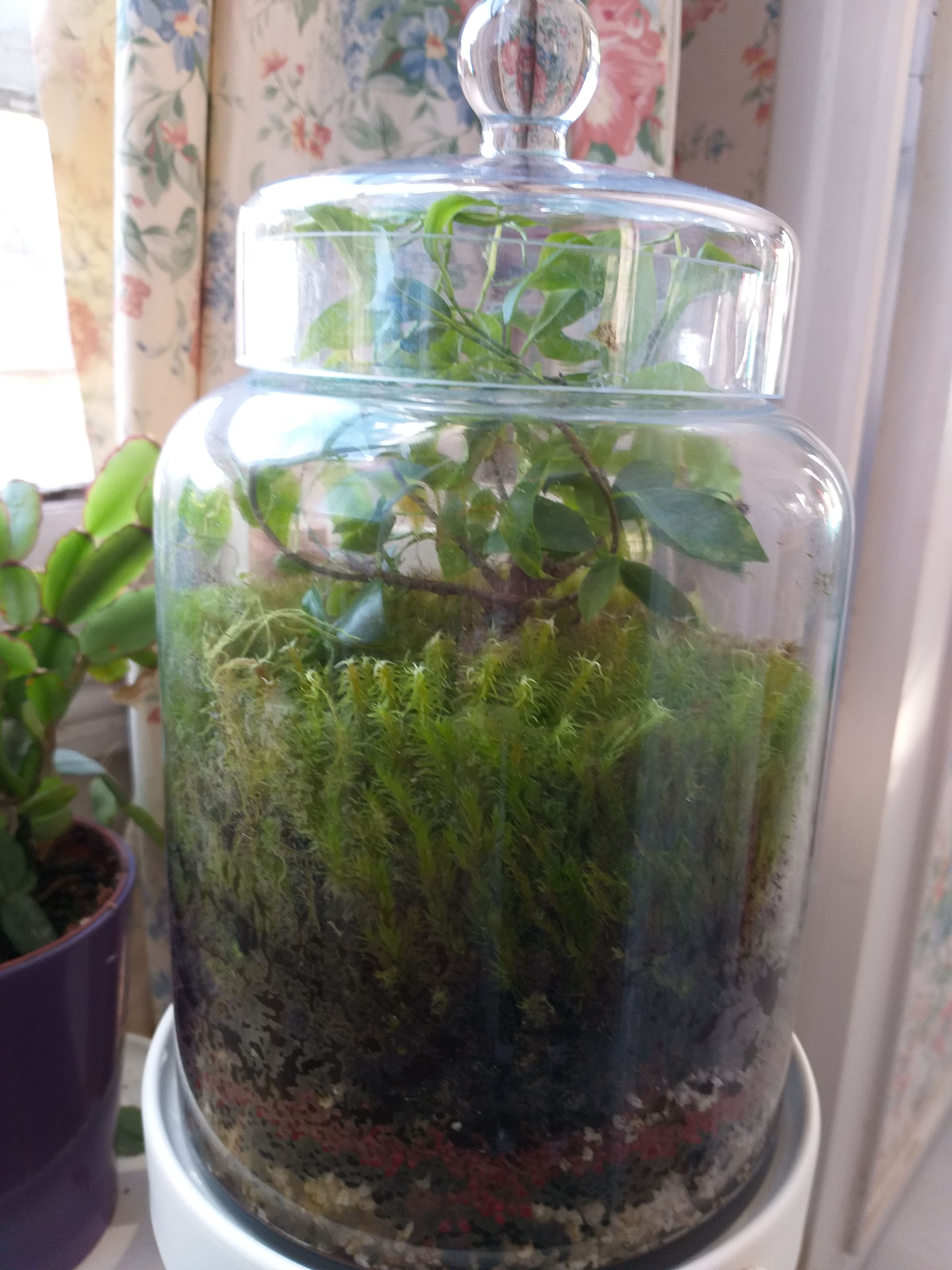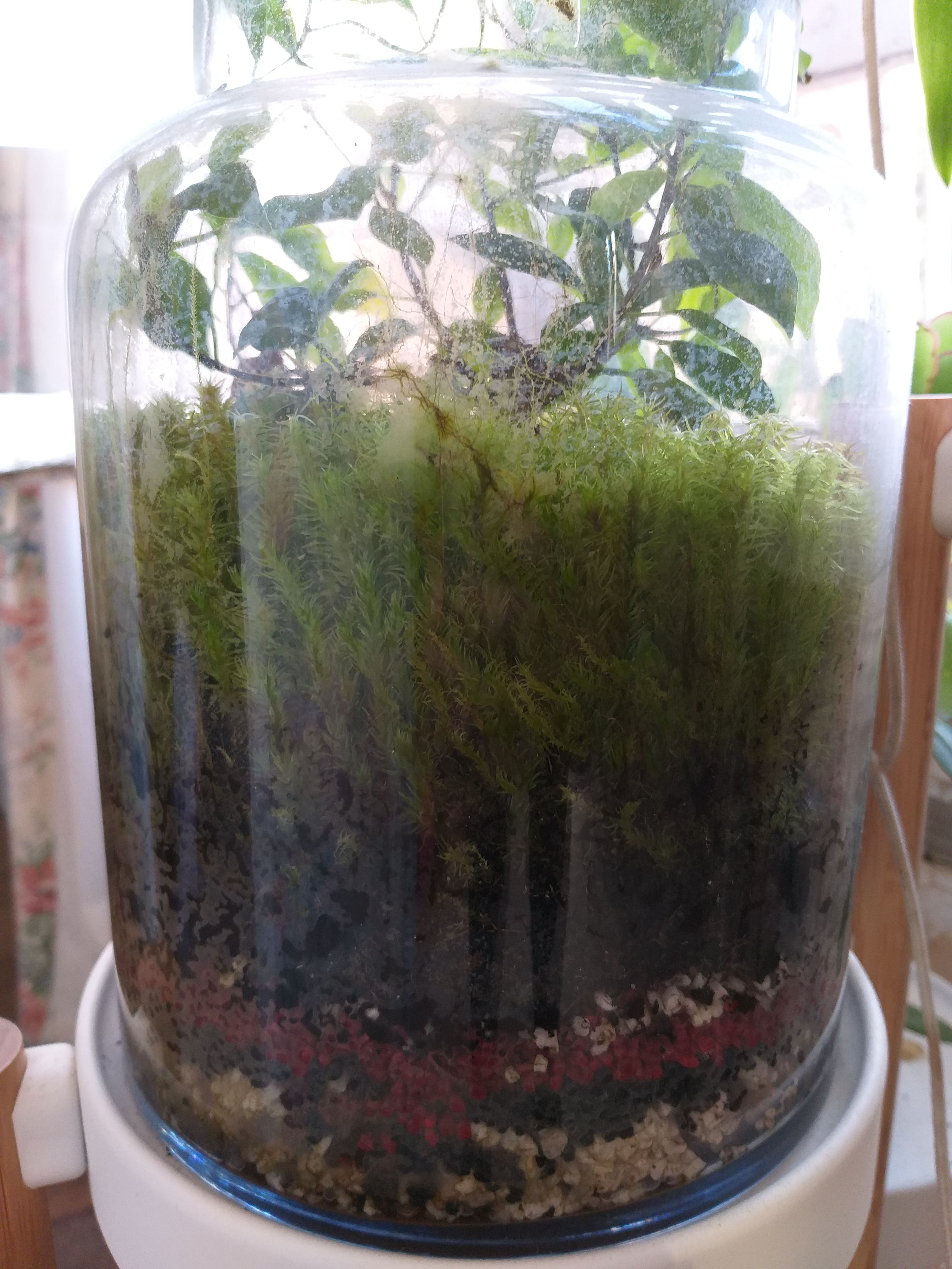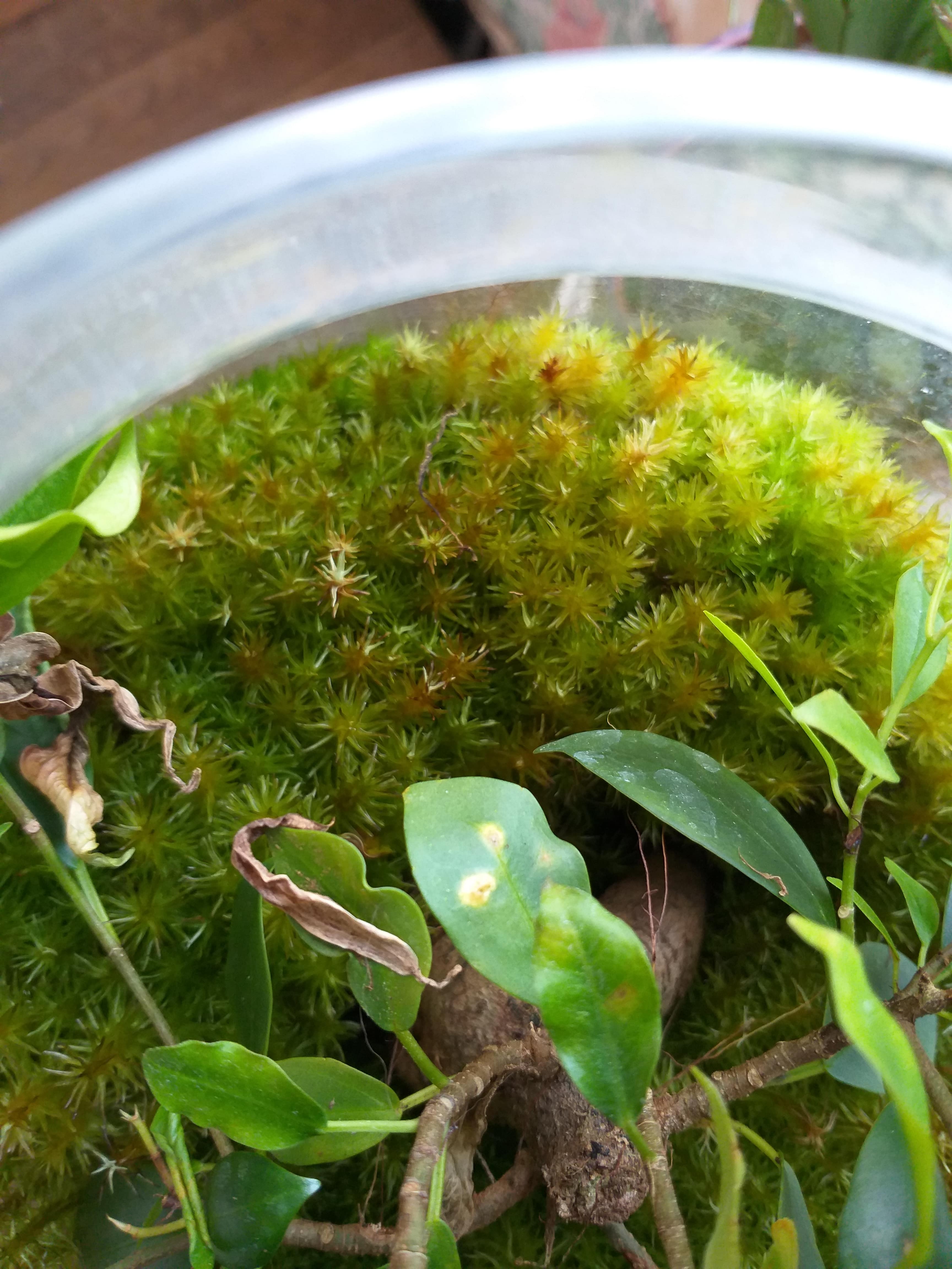 C'est un terrarium fermé qui contient un Ficus Ginseng (pas très sûre de l'espèce) et de la mousse sur un terreau et des graviers. Je l'arrose très peu et il est situé à côté d'une fenêtre.