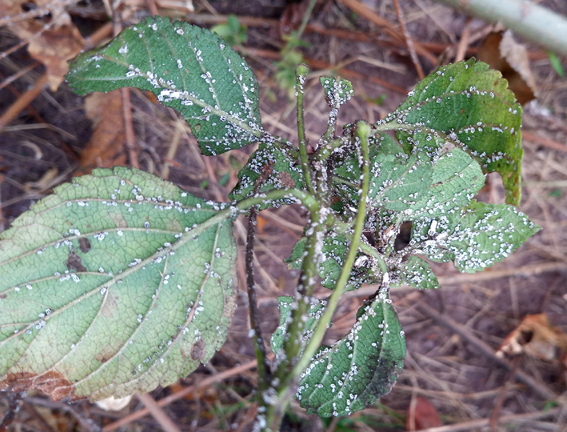 C'est sec et s'enleve facilement avec le doigt, s'accroche principalement sous la feuille.