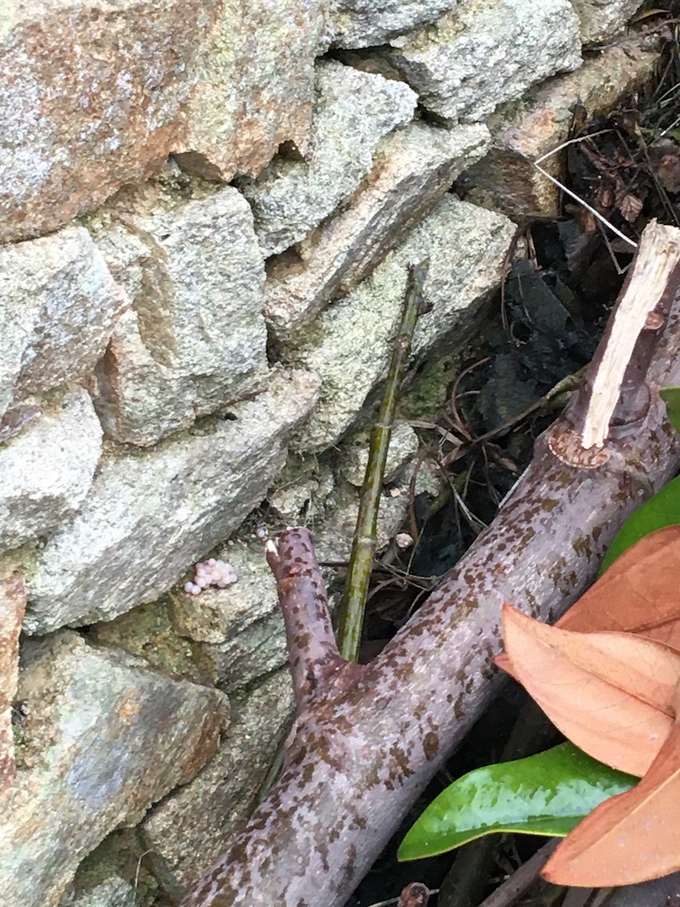 C'est la première fois que je vois une ponte ainsi exposée. Danièle, l'autre gentille jardinière venue à ma rescousse, suggère un escargot pomacea: je vais aller m'instruire ( il y a du boulot!)de cette possibilité . J'avais l'impression que les escargots( que j'aime beaucoup) de mon mur étaient tous cousins!