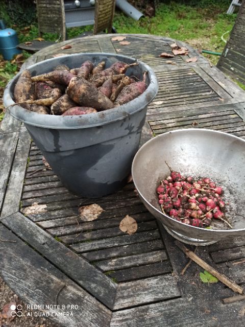 je déterre ensuite en essayant de casser au minimum les tubercules, pas facile car c'est gros et cassant (on a le temps après les premiers gels, les racines en terre ne vont pas geler de suite)