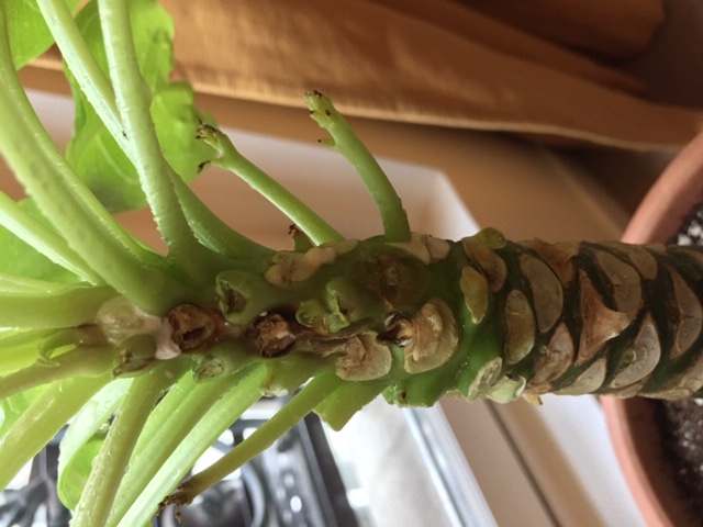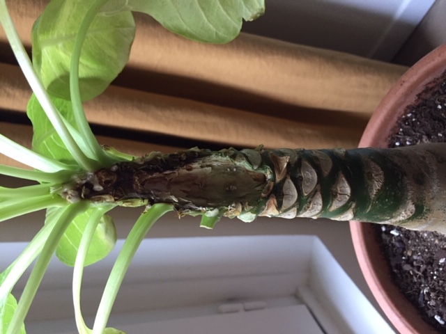 Il y a maintenant 2 semaines, après une attaque d'araignée rouge, j'ai eu un pourrissement de quelques feuilles qui a aussi atteint le tronc qui est devenu noir (les feuilles n'avaient plus de sève à leur base qd elle tombait). Ce début de pourrissement s'est un peu étendu mais que d'un coté avec secondairement le durcissement noirâtre du tronc là où ça avait commencé.