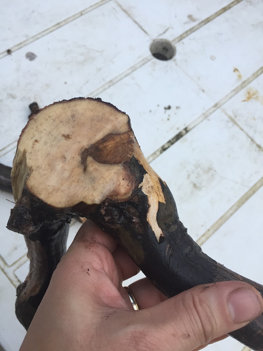 J'ai supprimé deux des trois troncs que comportait ma vigne Clinton, le troisième greffé a été maintenu. J'ai dégagé la terre autour de ces deux gros départs (sains) afin de scier environ 6 cm plus bas. La terre remis en place, j'ai ajouté du compost maison. En observant les deux coupes, je me suis aperçu de la présente d'une zone plus sombre sur la tranche de ces bois. A votre avis, est-ce une nécrose, l'Esca ?