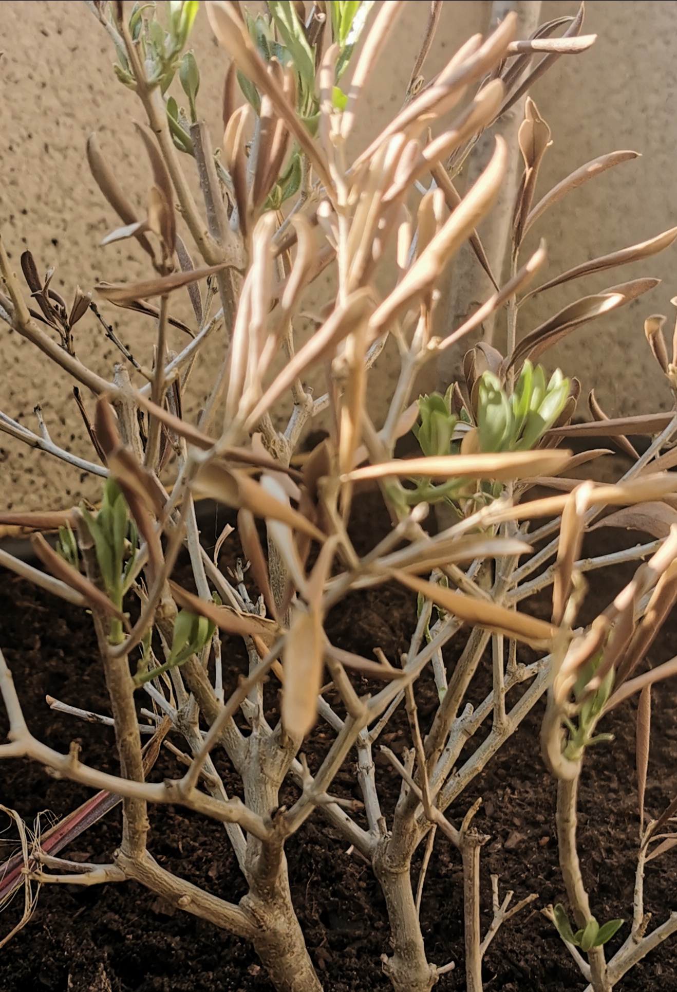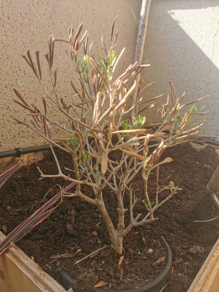 Bonjour à tous, cet été mon pauvre Olivier en pot à bien sécher j'ai cru l'avoir perdu, je l'ai mis en terre pour le sauver et il repart.
