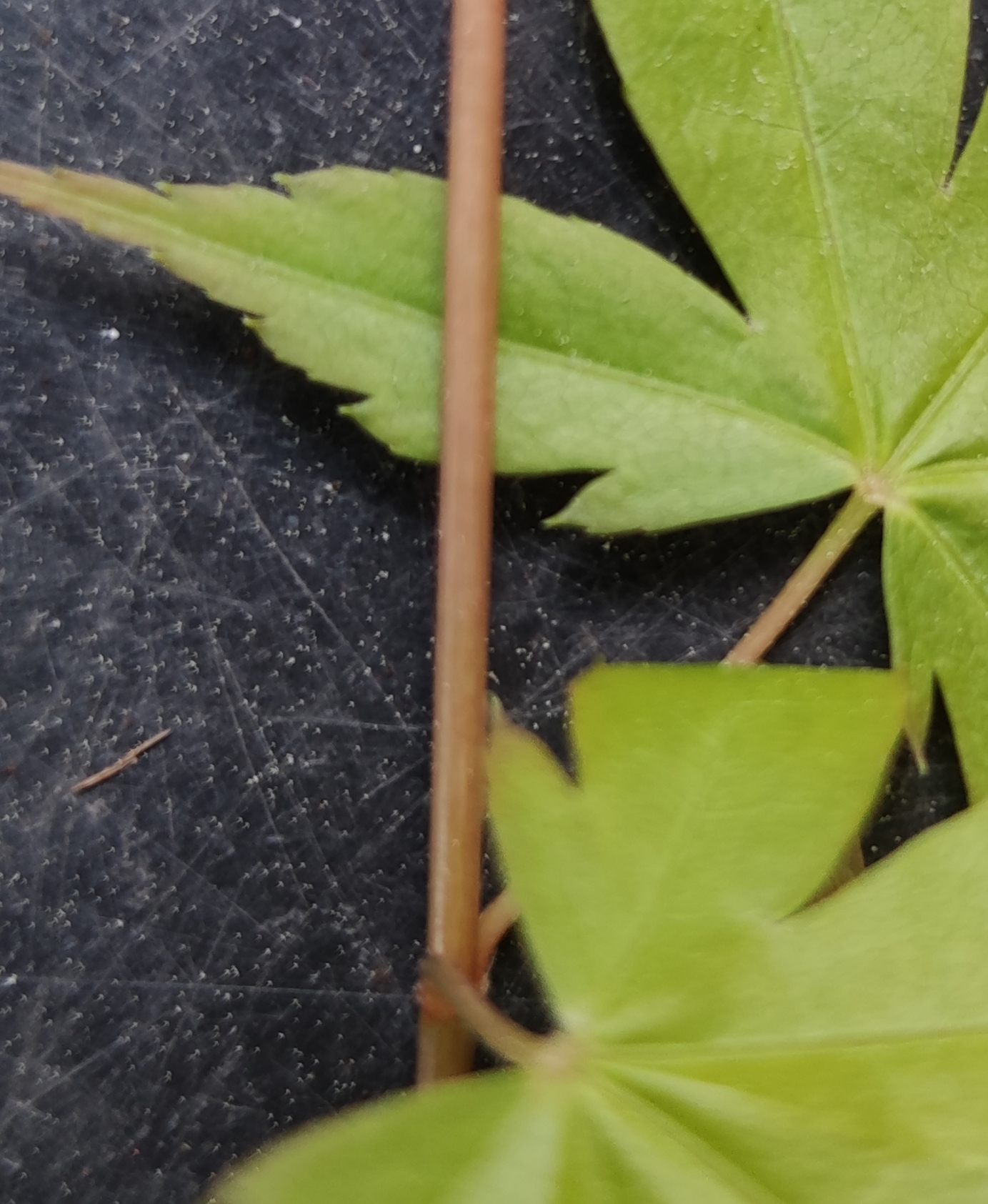 Désolé j'ai encore une question concernant mon érable... On parle souvent des tâches noires sur le bois des érables comme étant un signe alarmant. Mon Katsura n'a pas de tâche noire sur le bois mais je viens de m'apercevoir qu'il avait parfois des petites tâches noires bien visibles au niveau des pétioles (Cf photo 1 ci-dessous). Est-ce que c'est un signe de maladie?