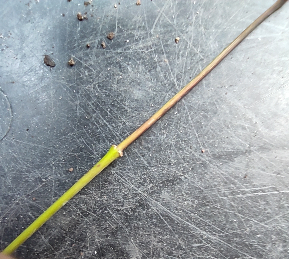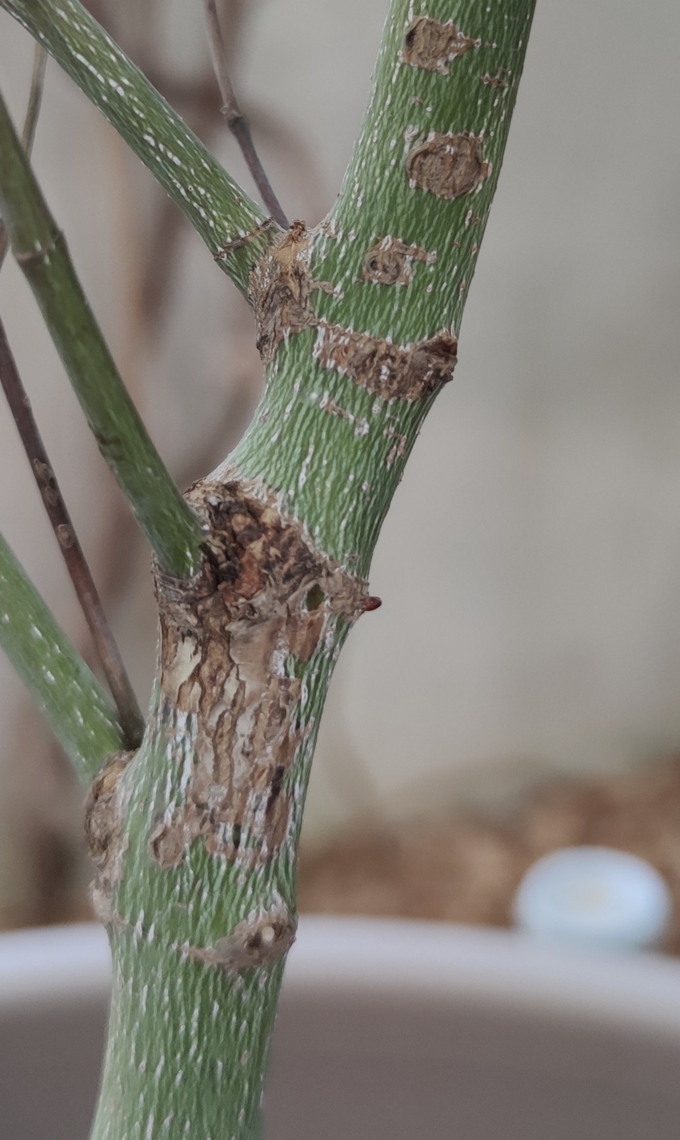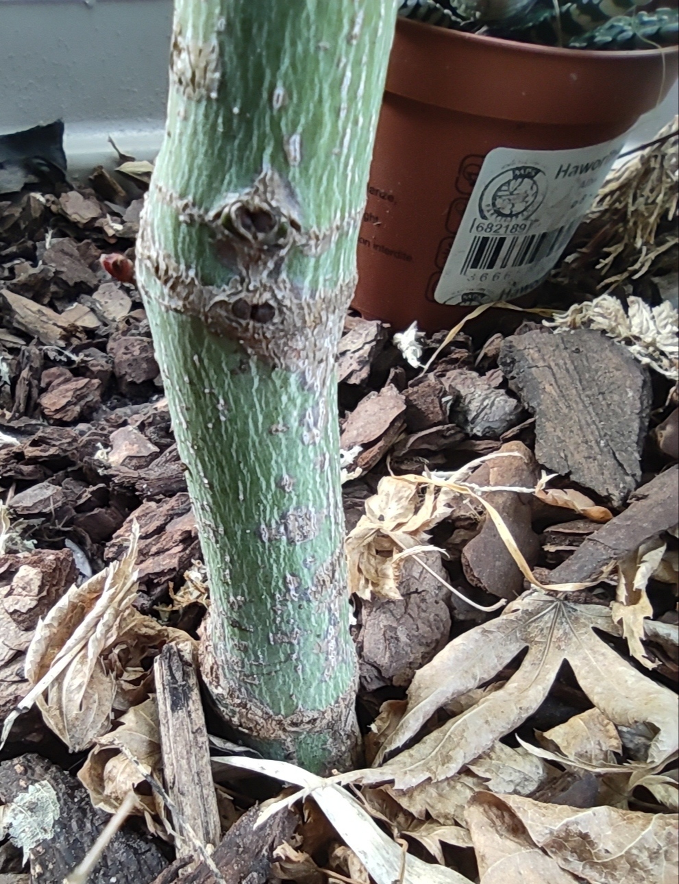 La tige qui pendait : Certaines extrémités dégarnies : Le tronc qui est bien vert mais parfois à des tâches grises (début d'écorce?) :
