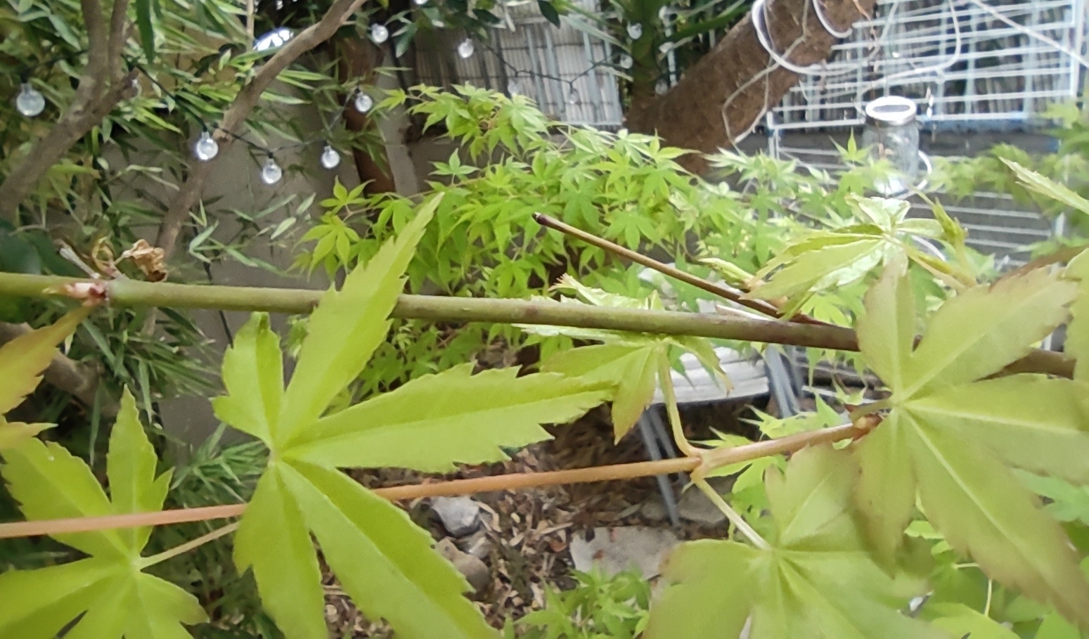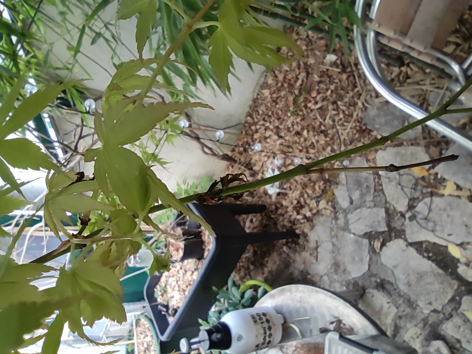 Un autre truc : l'année dernière en fin d'été après avoir perdu pas mal de feuilles aux extrémités des longues branches, certaines feuilles restantes avaient des tâches comme brûlées mais en mosaïques (des sortes de ronds brûlés). L'érable est a côté de bambous qui ont en permanence ces sortes de tâches mais plus allongées sur le bambou ainsi que d'une glycine qui au printemps a aussi des tâches rondes jaunes (je suspecte un virus style mosaïque mais vraiment pas sûr).