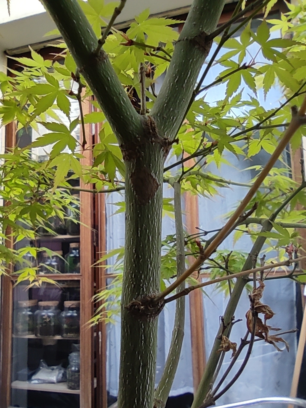 Je reviens donner quelques nouvelles de mon Katsura. Les feuilles ont continué très progressivement à sécher. La bonne nouvelle je pense est qu'il a fait quelques nouveaux départs récemment (deux sur le tronc, et deux tout en haut).