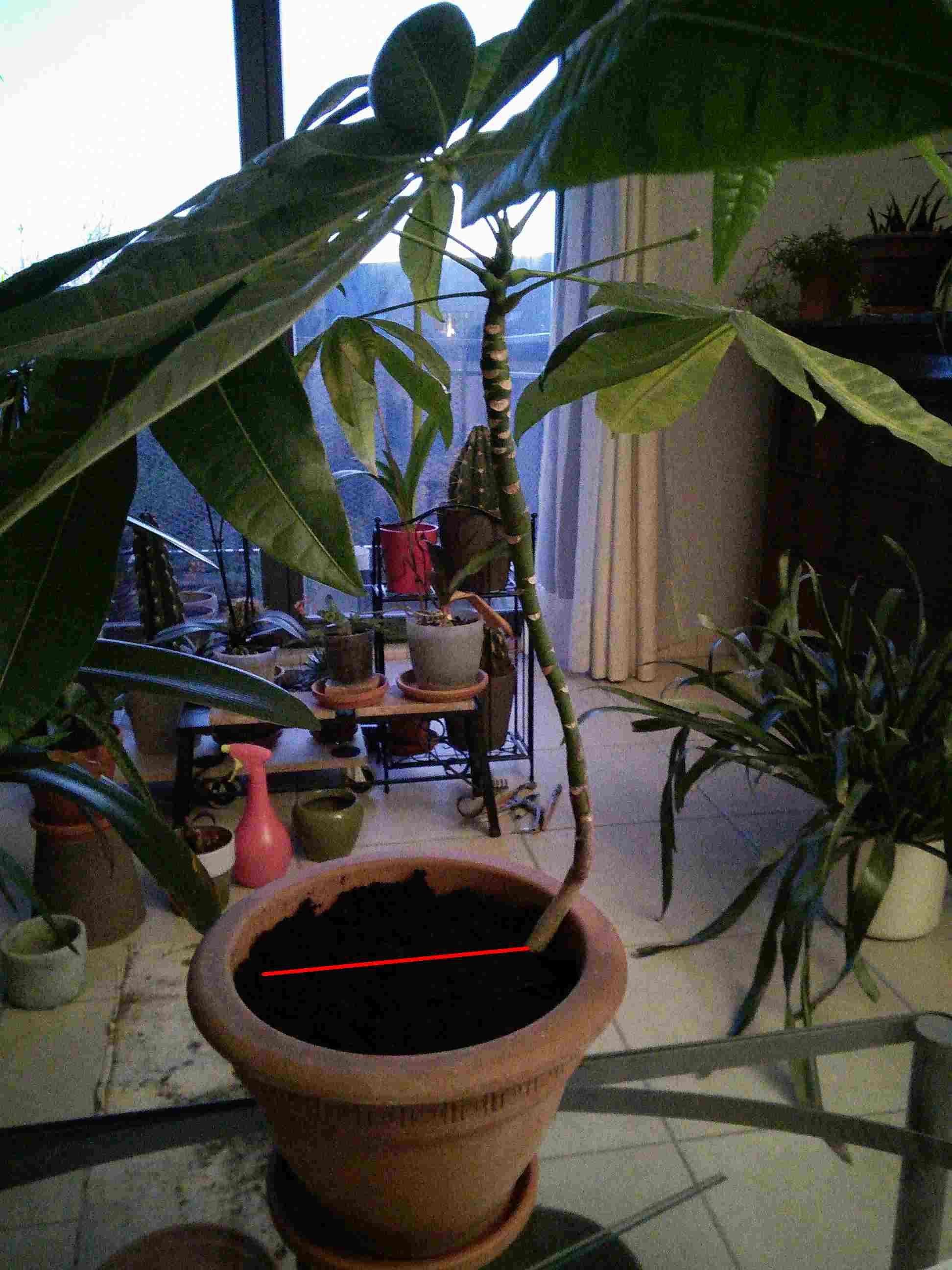 J’ai en ma possession un Pachira (aquatica, je pense) et il a poussé de travers et j’ai dû le planter bizarrement (grosso modo, il a une forme de L, voir photo, le reste du tronc est enterré, trait rouge). J’aimerais bien le couper pour le redresser mais je ne sais pas où. J’aimerais aussi bien que les deux parties soient, si possible, récupérables. Merci pour vos conseils.