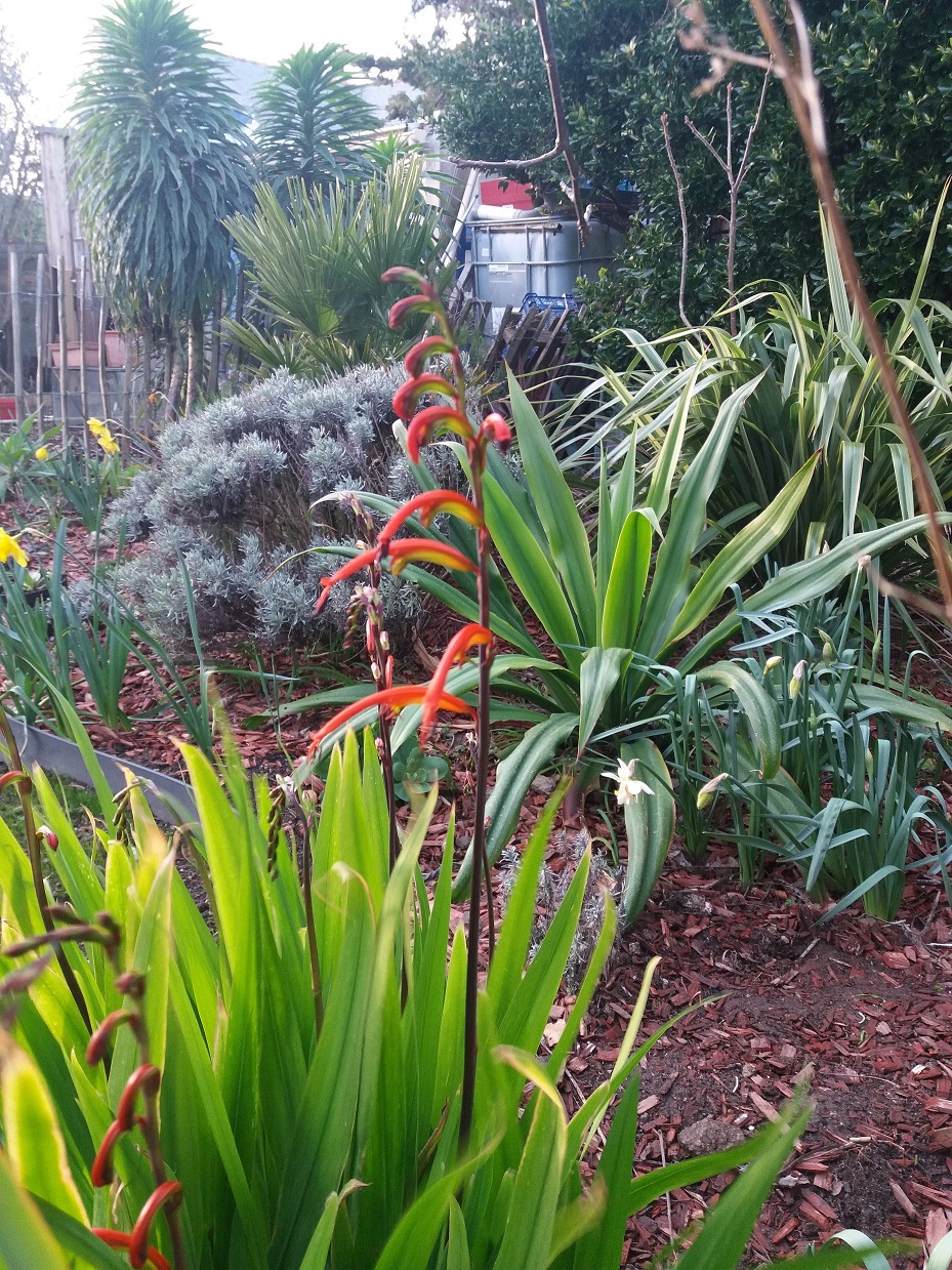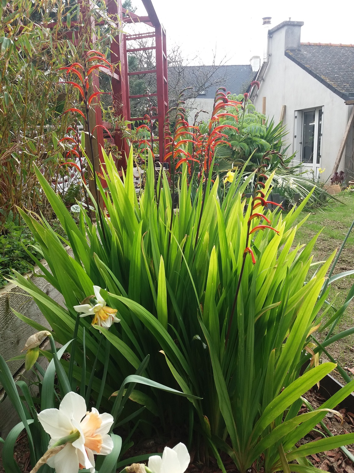 A la différence des crocosmias ''classiques'' de mon jardin, celle-ci n'est pas caduque. De temps à autre quelques feuilles sèchent dans l'année, mais la touffe ne s'effondre pas subitement raide morte comme ont la faucheuse habitude les autres crocosmias.