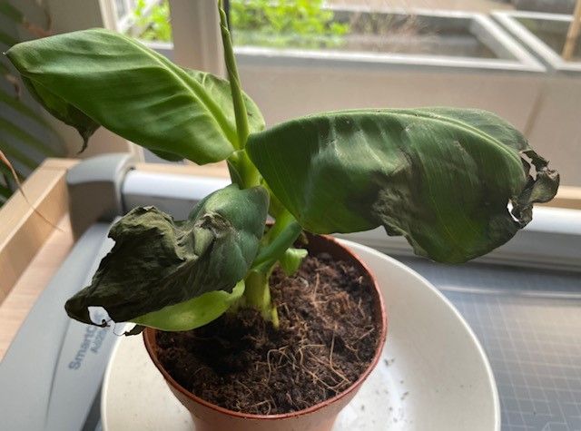 J’ai besoin de votre aide.. je vous explique j’ai reçu un bananier musa hier qui a visiblement un peu subi le trajet en colis.. je l’ai laissé tremper dans une coupelle d’eau puis mis derrière la fenêtre qui ne reçoit pas de soleil direct mais il a trempé dans l’eau dans le patio et il a fait chaud.