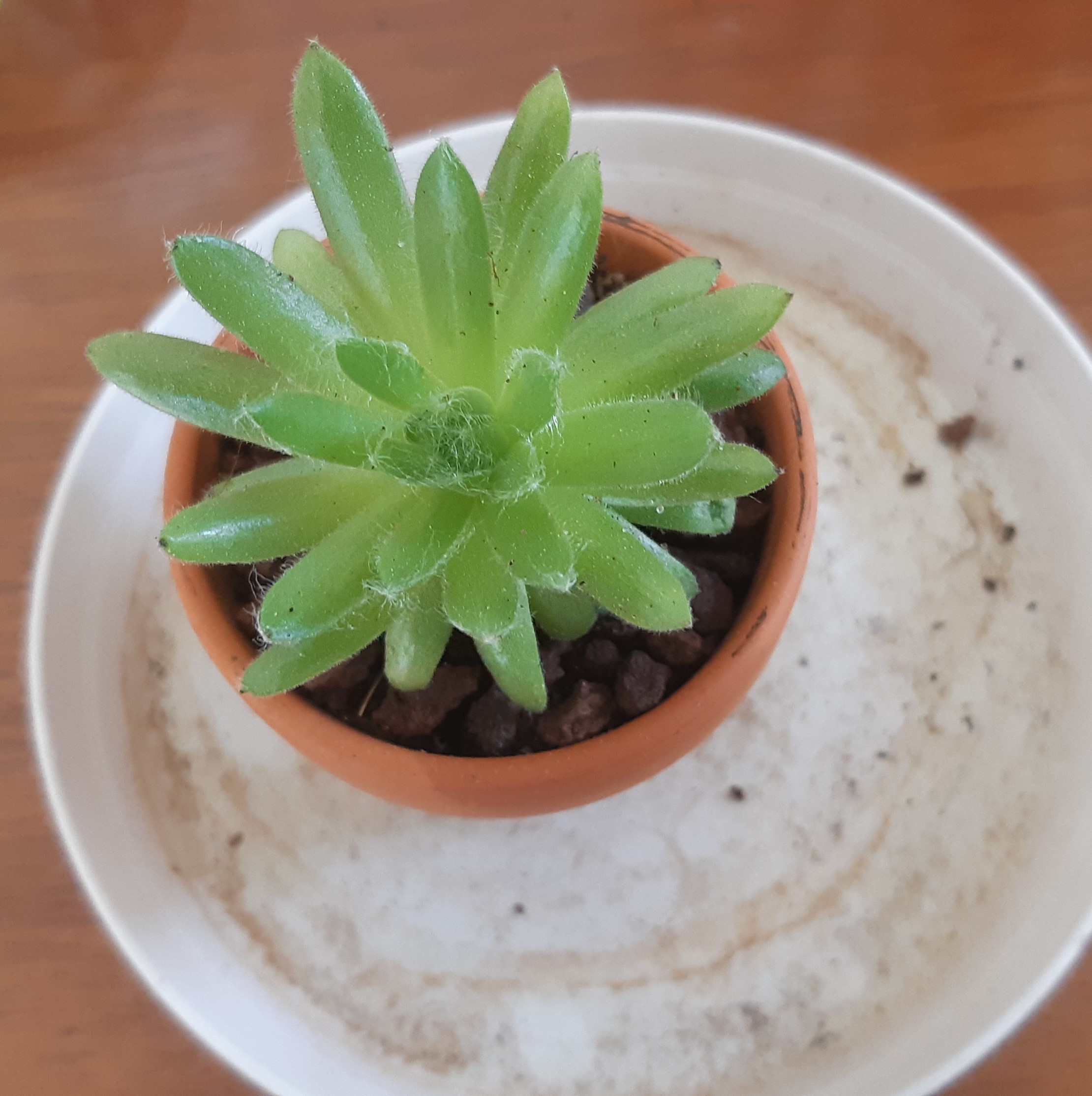 Une succulente avec une soucoupe...Inutile puisque l'on ne l'arrose que très rarement! La photo est trompeuse car on a l'impression que le récipient est encore humide.