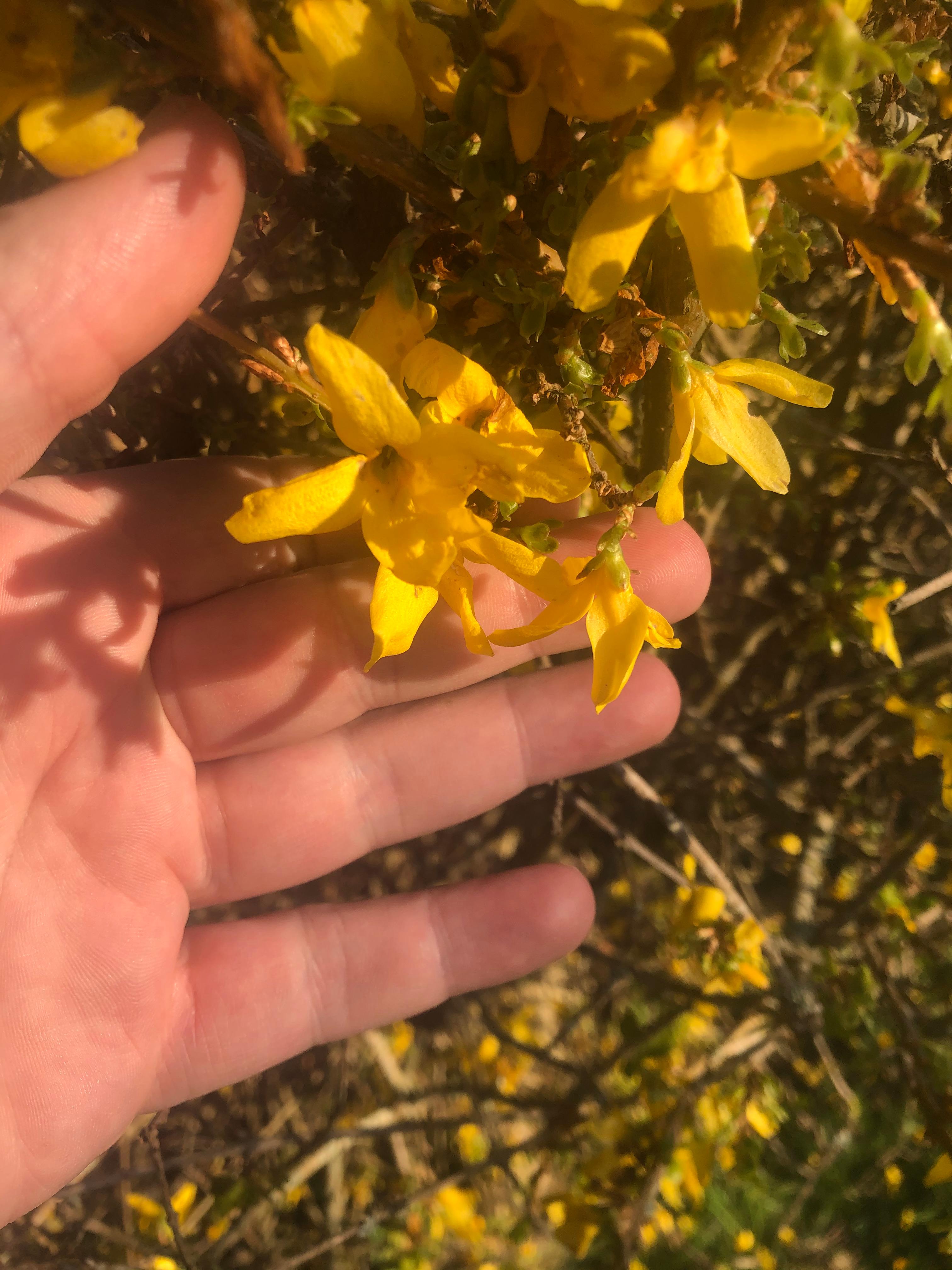Voilà une petite haie de forsythias que j'ai faite avec des boutures faites à partir de papa forsythia.