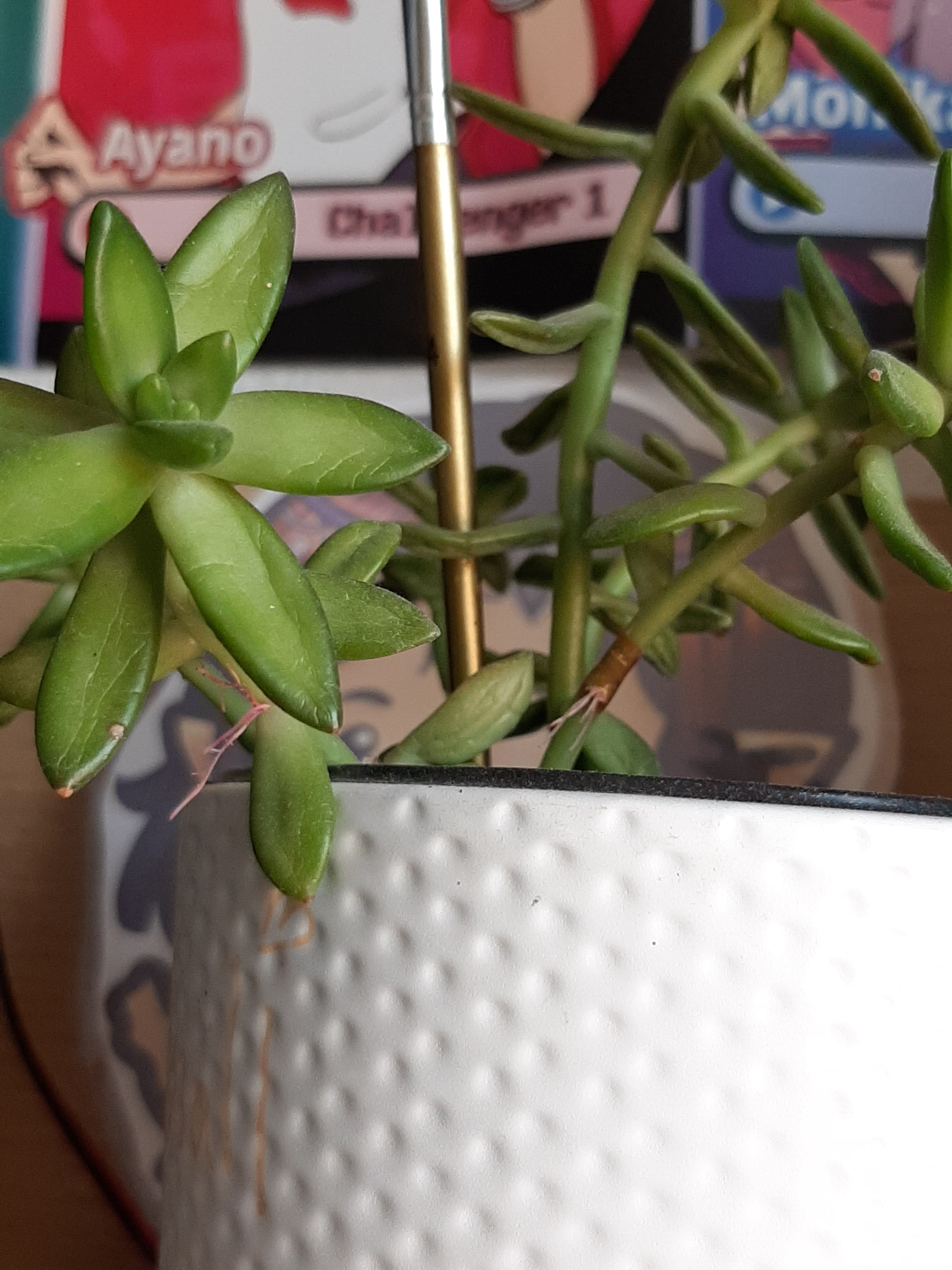 Déjà elle a des taches rouges sur quelques tiges (en hauteur, et ça m'etonne qu'elle ait de la moisissure alors que je l'arrose pas?), des pétales un peu flétris et qui rougissent...Et des espèces de racines/poils absorbanrs qui sortent des taches.