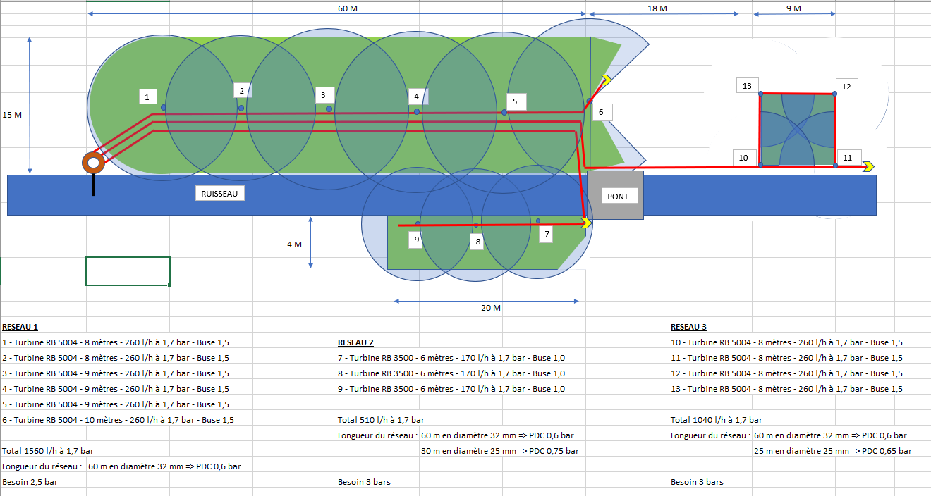 J'ai prévu 3 réseaux mais je ne sais pas si c'est trop ou pas assez ? Quand je fais la somme des débits nécessaires, j'ai l'impression que 2 réseaux seraient presque suffisants à moins que je n'ai rien compris aux tableaux de performance des turbines. J'ai prévu de tout mettre en Rain Bird.