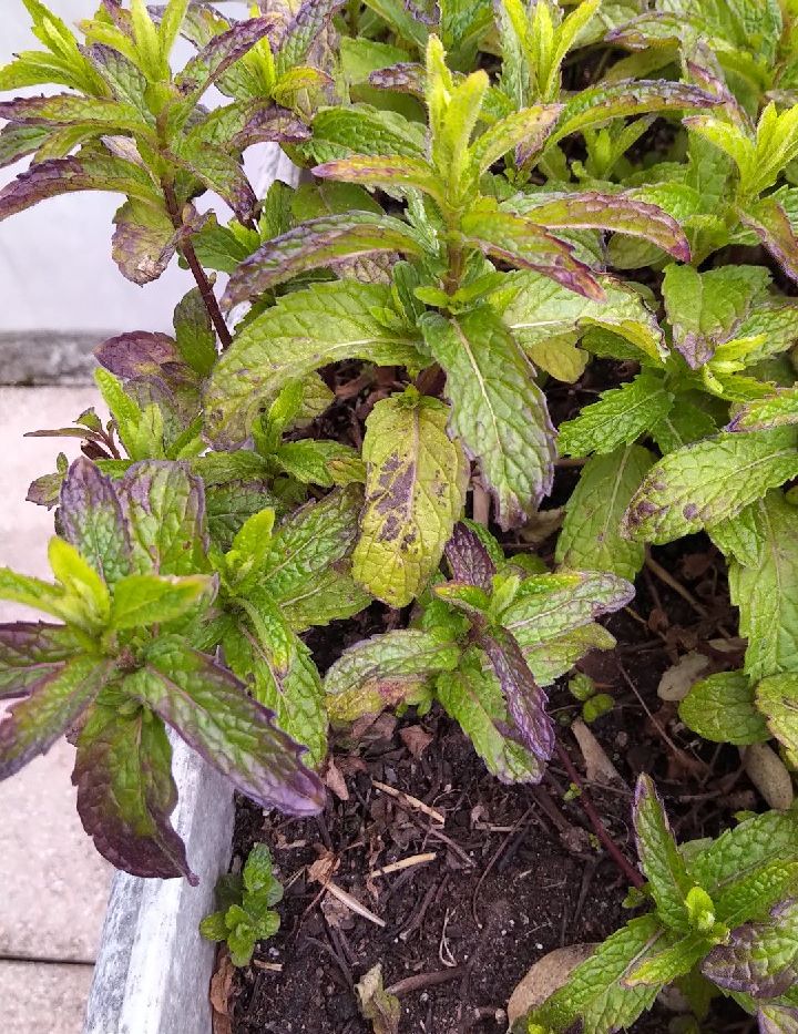 Sur une terrasse, j'ai quelques bacs plantés de menthe. Tous les ans, je récolte de très belles branches de feuilles bien vertes. Cette année, dans la plupart des bacs, les branches commencent à pousser mais les feuilles vertes au début des bourgeons deviennent ensuite violettes. C'est la première fois que j'observe ce phénomène.