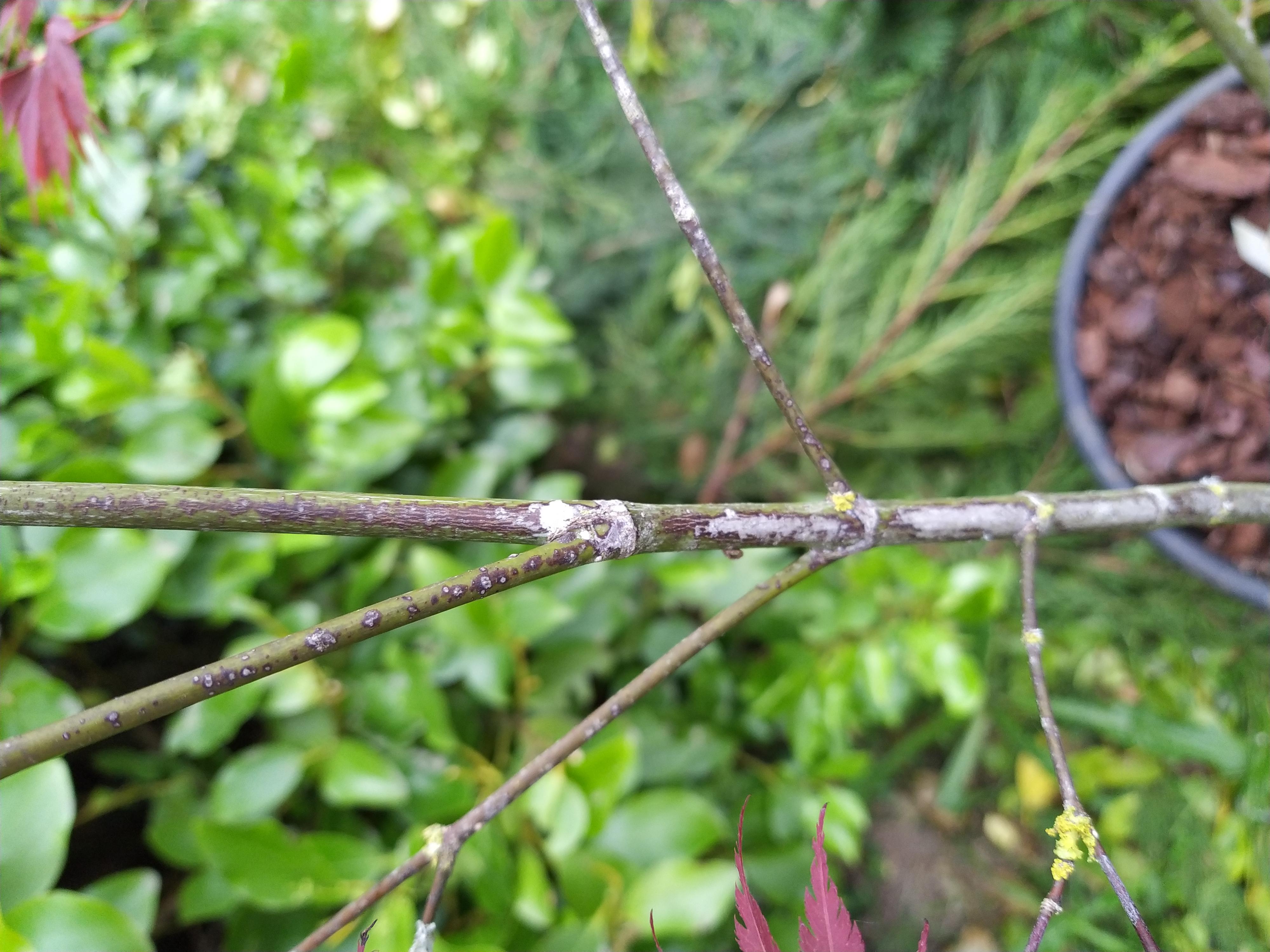 Photo du 8 mai 2021, des petites taches brunes. Sur un érable qui a souffert, qui n’a pas de nouvelles racines début mai, la malnutrition peut entrainer le dessèchement du cambium (qui noircit) sans que ce soit une maladie caractérisée.