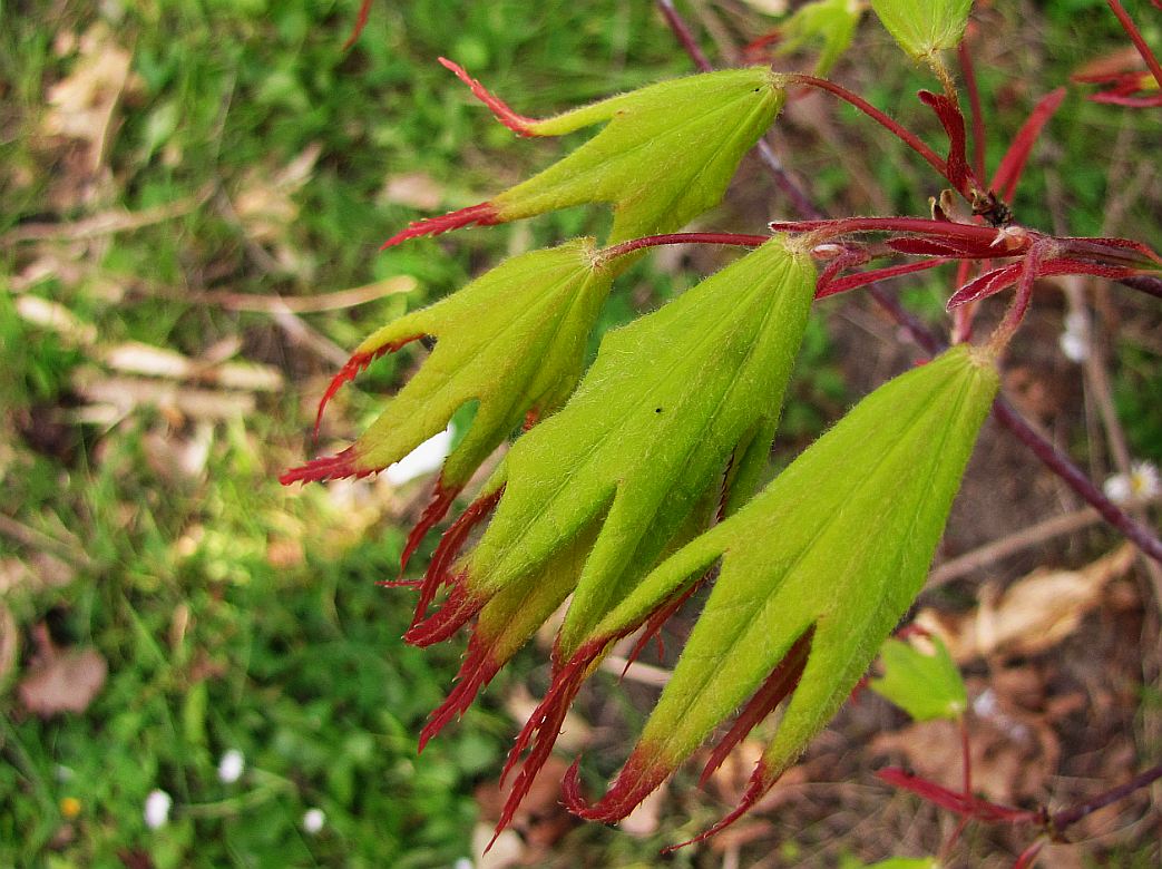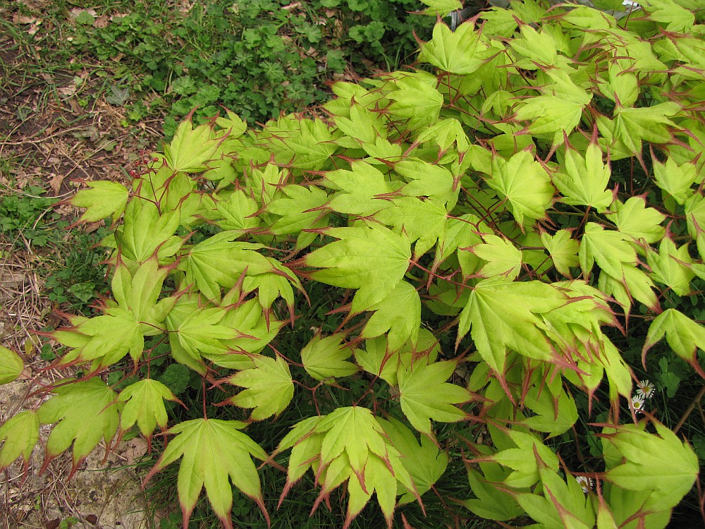 Un érable aux feuilles de 5 à 7 lobes, assez larges, vert tendre aux pointes rouges au printemps et finement dentées de façon régulière. Les feuilles ont tendance à pendre quand elles sont jeunes et le port,sans être pleureur est arrondi. Il atteindrait 3 m en hauteur et en largeur.