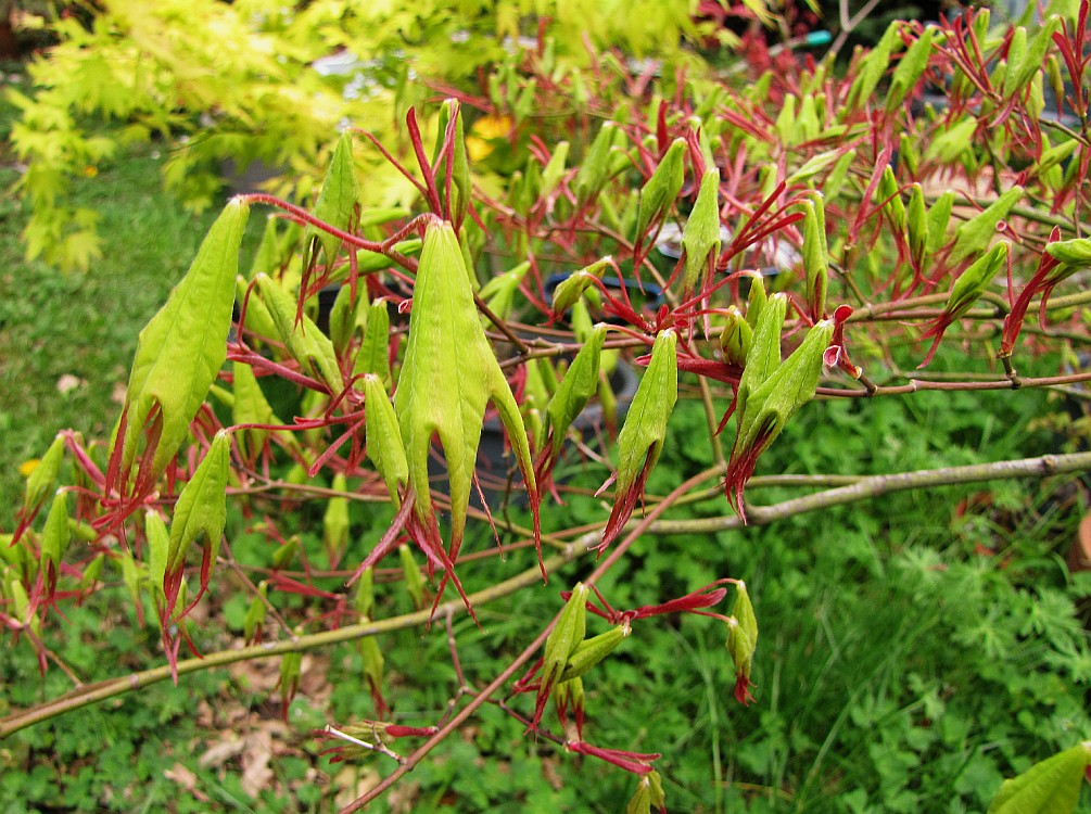 Pour la première fois, des fleurs. Très peu, et rien ne dit qu'elle donneront des samares, et que les graines seront viables. Mais j'aimerais tant, je l'adore, et même si les enfants ne ressemblent pas aux parents, je les élèverai.