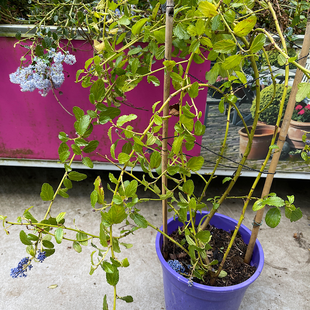 Bonjour, j’ai acheté ce céanothe en jardinerie. Il n’avait aucune variété de précisé donc j’ai demandé a une vendeuse qui m’a affirmé que c’était une version grimpante et non rampante car elle était tuteuré. Juste a coté de la variété que j’ai prise il y avait la variété repens qui ne ressemblait pas a celle ci (bleu différent et pas de tuteur ...) quand je suis revenu chez moi je voit une étiquette sur le pot où c’est ecrit Ceanothus thyrs var R mais pourtant rien avoir avec la variété rampante juste a coté. (Erreur d’étiquettes ?)