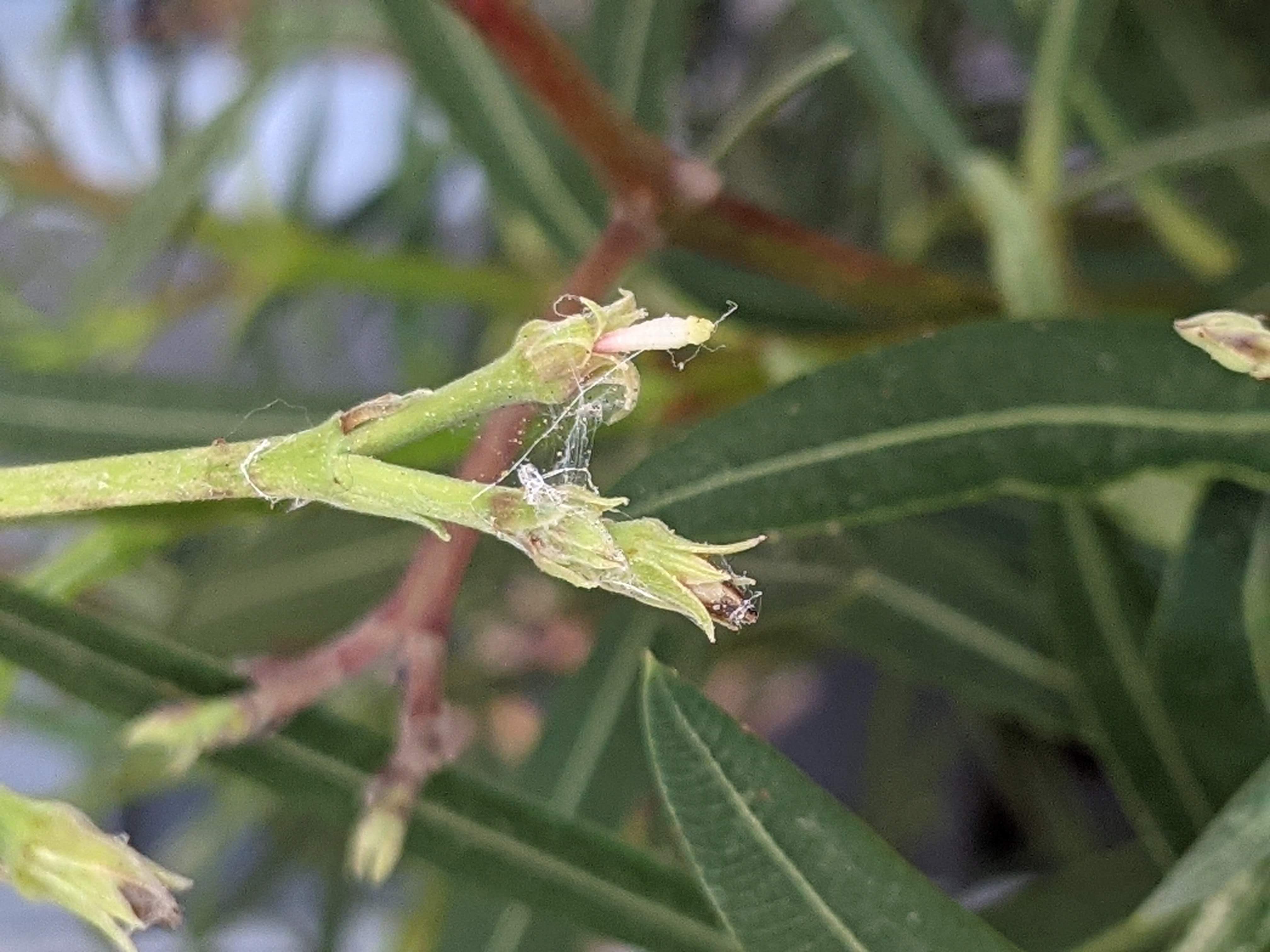 En gros plan bourgeons + filaments / toiles : Il semblerait que ce soit des acariens ou des araignées ?