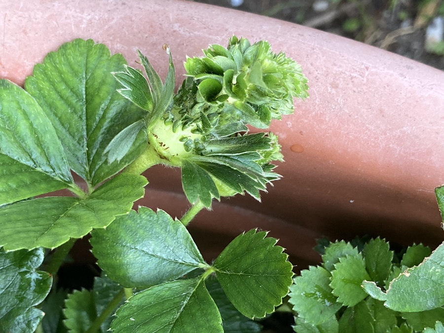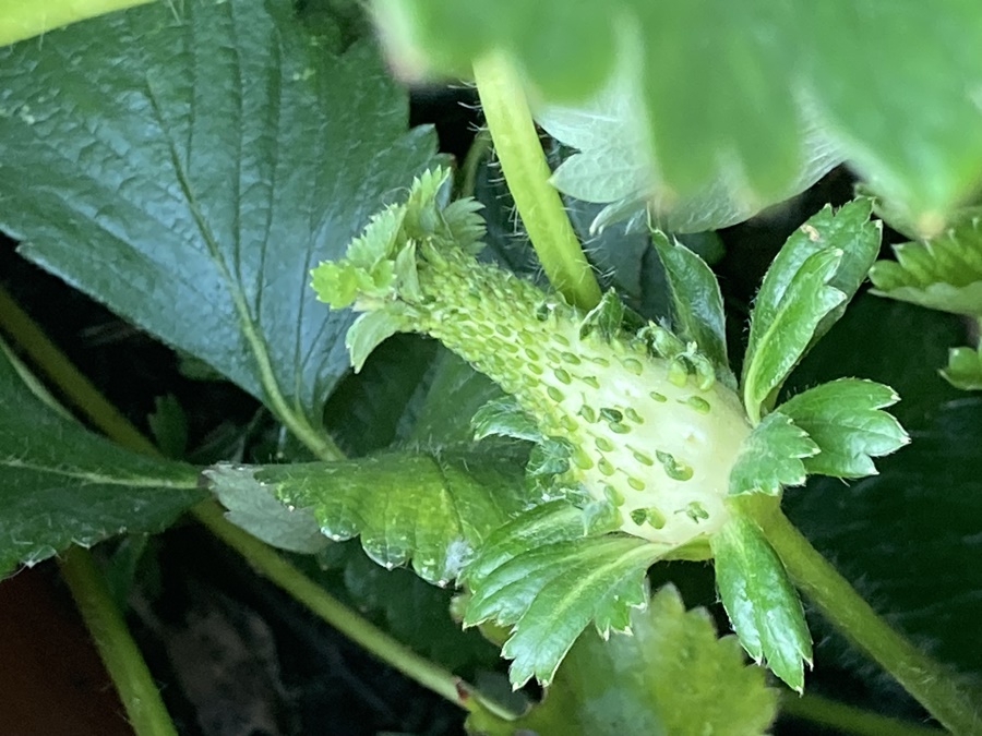 Cette année, je suis surpris de constater que les fruits de mes fraisiers ont une drôle de forme. Sur ceux-ci poussent de petites feuilles.