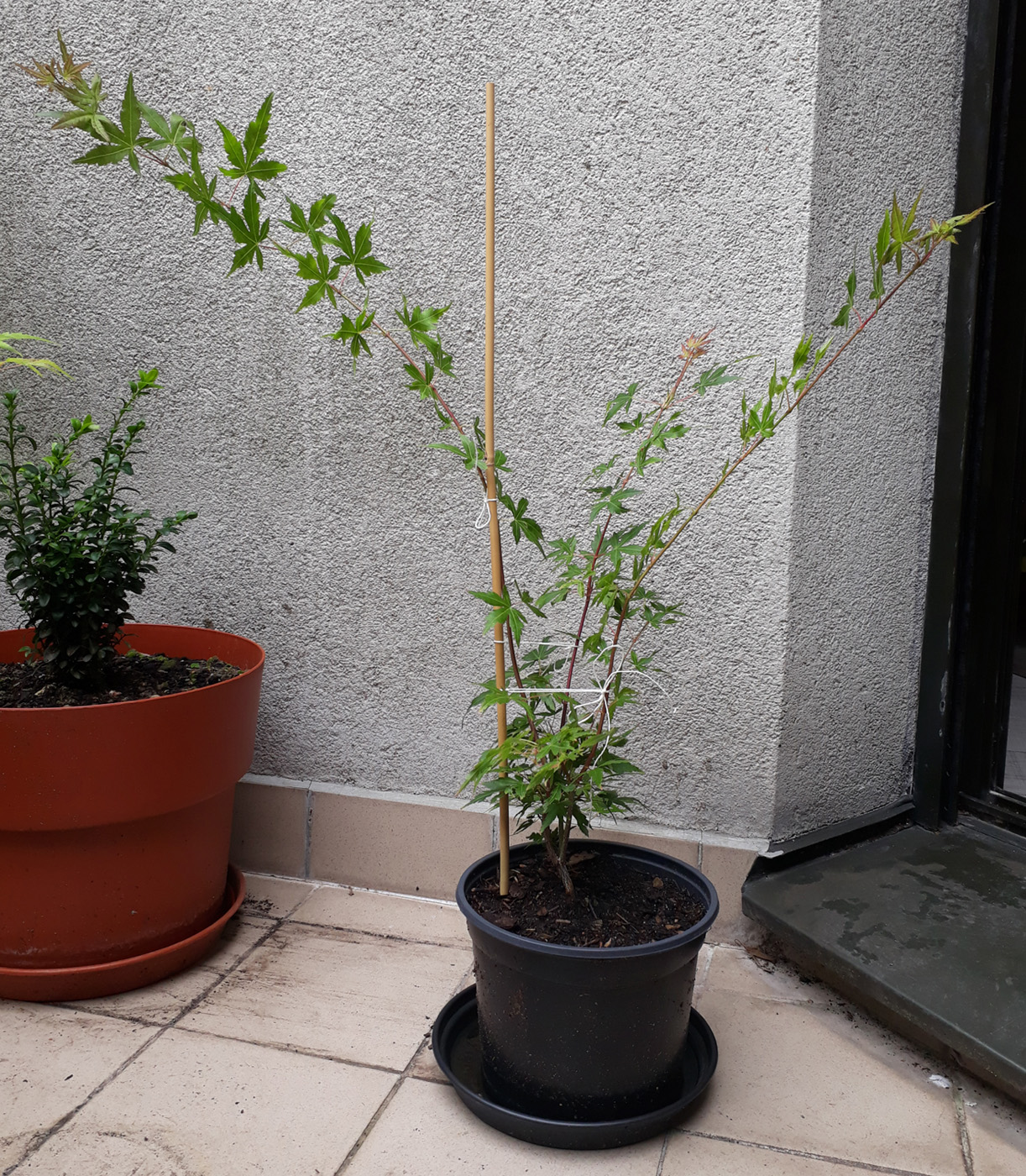 Pour cet érable-ci, je suppose que je pourrais planter un tuteur dans le pot puis y attacher la plus longue des branches. L'aspect sera assurément un peu étrange car c'est une branche sans ramifications (pour l'instant), toute droite et vraiment longue. Pour les deux autres, je ne sais pas trop (j'admets qu'elles gênent un petit peu).