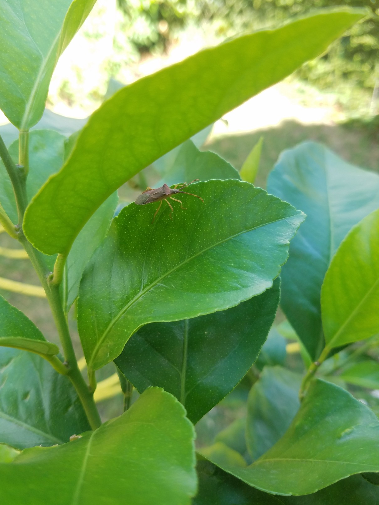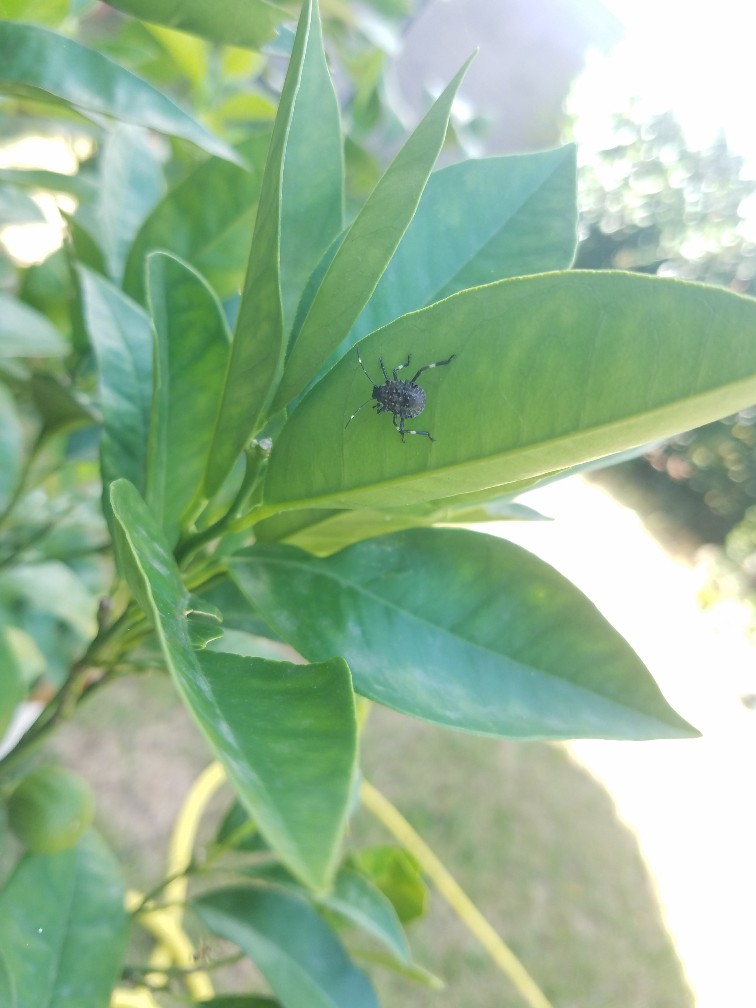 Mon citronnier abrite plusieurs insectes dont je ne connais pas le nom. Deux ressemble Ă des punaises et un Ă un criquet.
