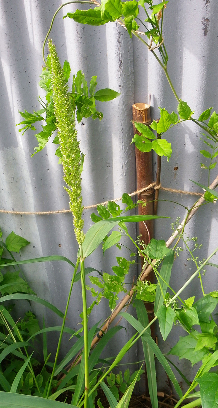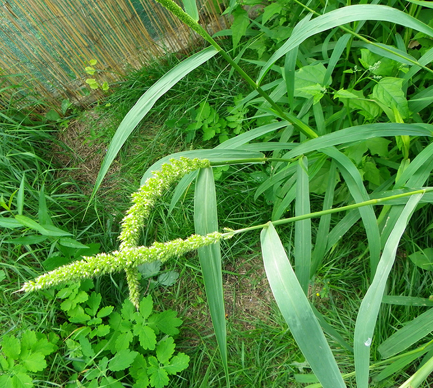 Haute et élancée, elle a de longues feuilles fines genre roseau, et les épis font velcro.