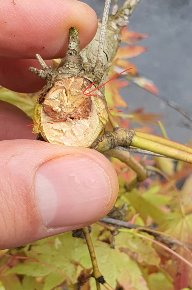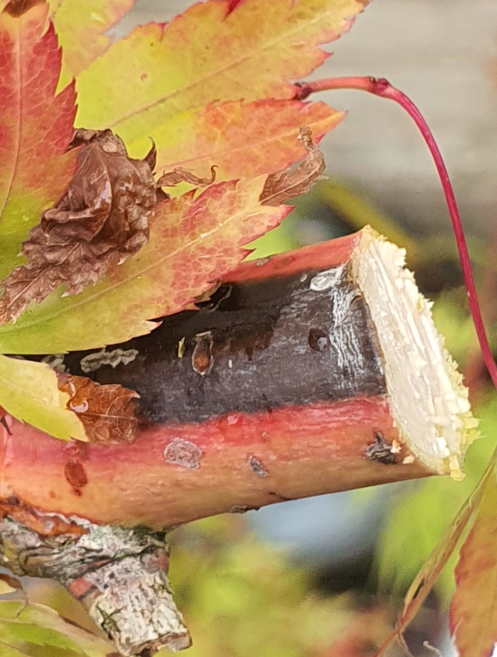 --Une tache noire sur bois d’Acer veut dire que le phloème ordinairement vert est mort. J’insiste sur ce point, on ne peut pas attribuer une tache noire aux seules bactérioses, même si c'est souvent le cas mais pas que; quand aucune sève ne redescend le phloème n’est plus alimenté, il meurt en noircissant sans aucune maladie.