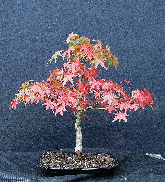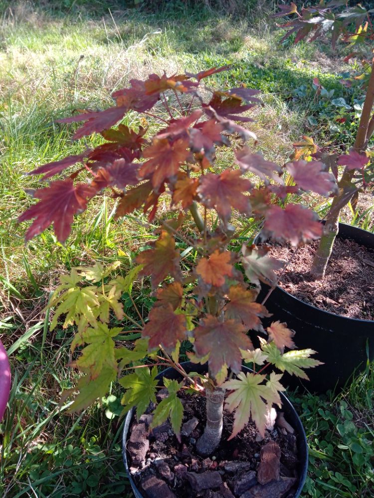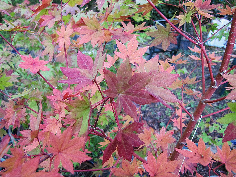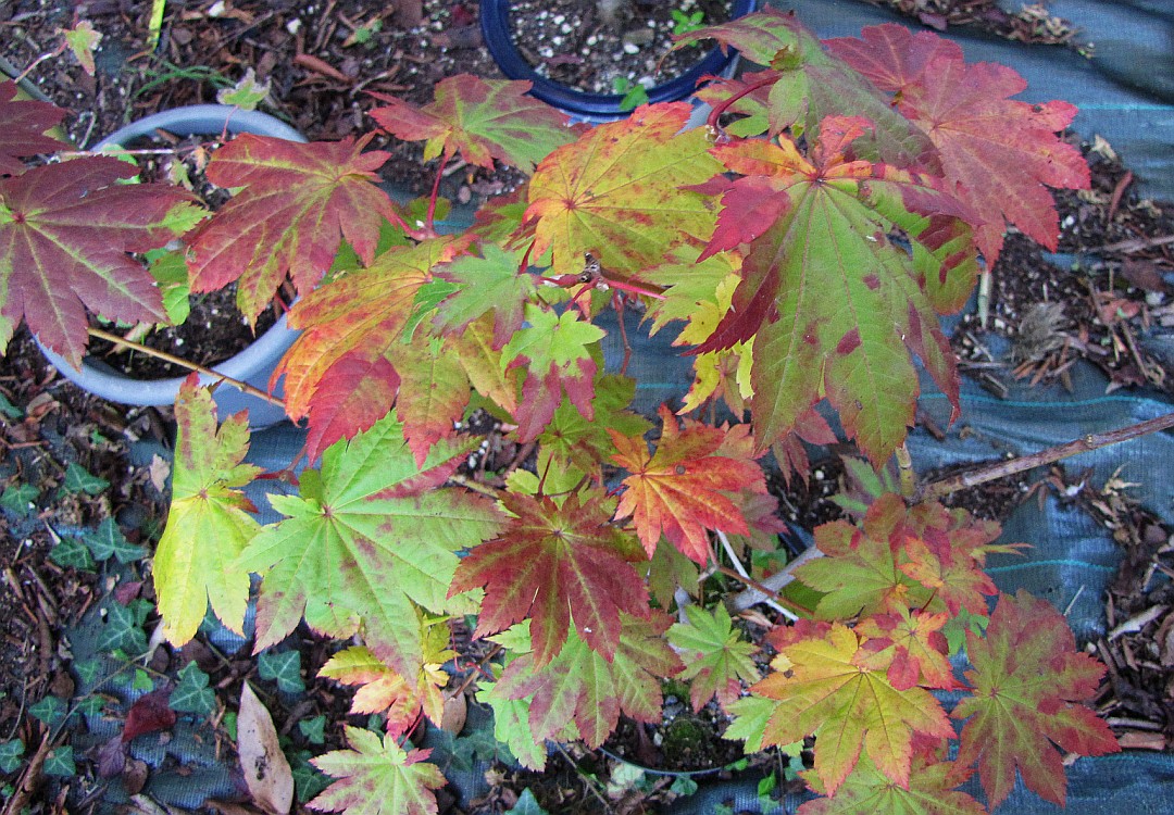 Certains des miens sont dans des pots très plats, pas étonnant qu'ils soient les premiers à prendre des coleurs d'automne, comme cet 'Orange Dream', alors que son frère (tous deux sont des marcottes du même arbre) est encore bien vert. Celui dans un pot à bonsaï a été plus exposé au soleil, ce qui est aussi un facteur, ainsi que le substrat :