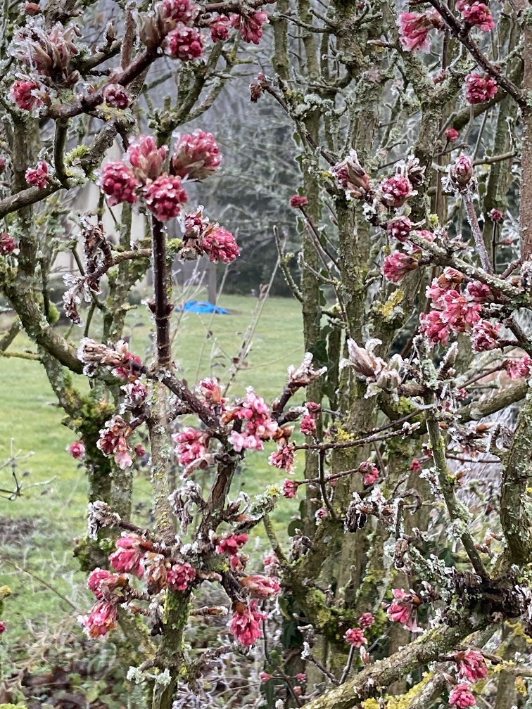 Sous le givre les fleurs du Lonicera Fragrantissima