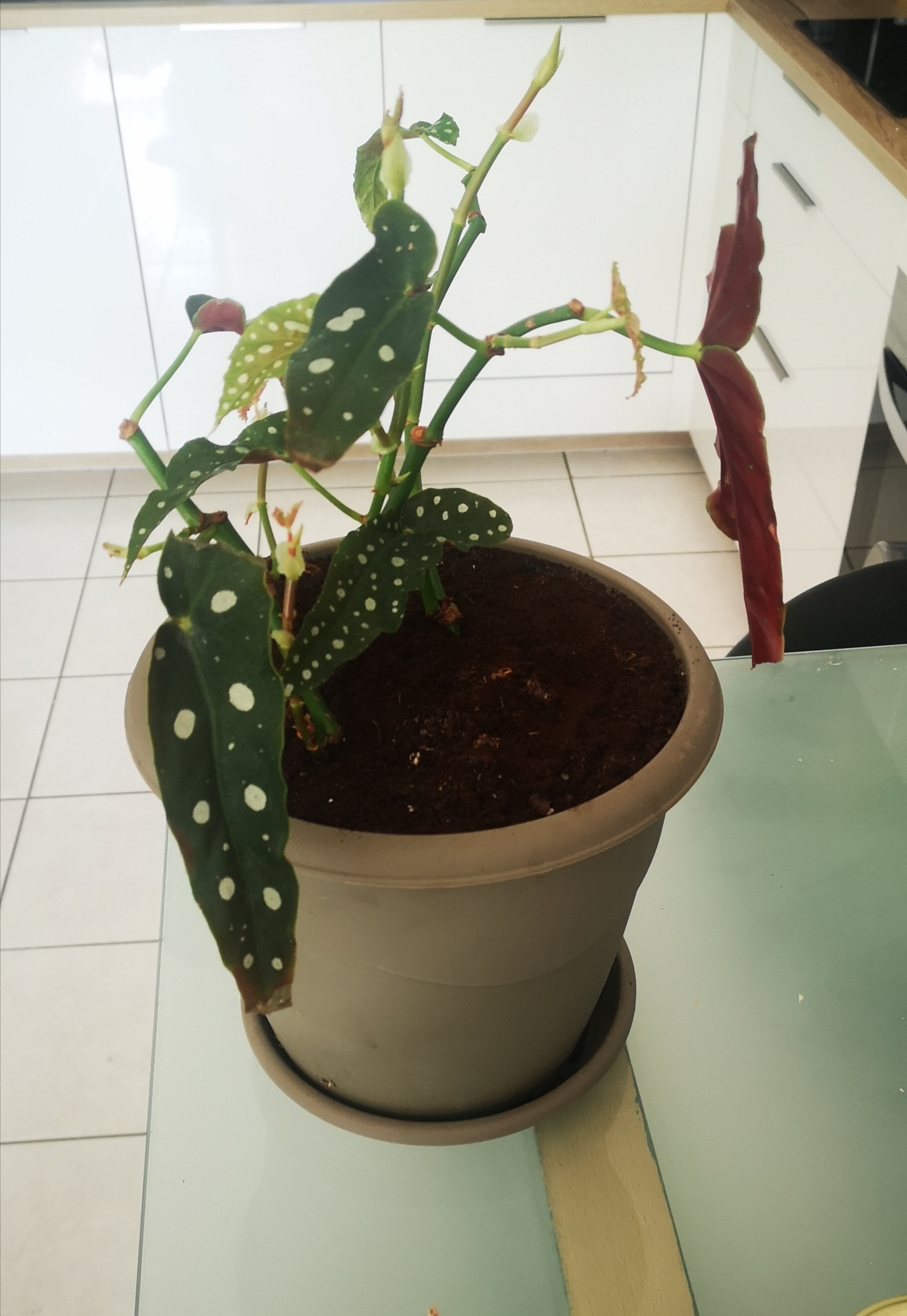 Attention, les Begonia n’aiment pas les pots profonds, leurs racines qui sont très fines et assez courtes y pourrissent. Il vaut mieux un pot en forme de coupe. Là ton pot est trop profond. Pour l’instant ça va, il n’est pas si mal en point malgré ses pertes de feuilles, mais ça risque de ne pas durer.