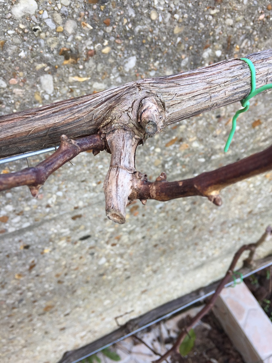 Pour la taille, il m’arrive d'avoir des doutes alors je taille les 2 à 2 yeux et je recoupe celui qui ne me plait pas car parfois le brin de remplacement est mal nourri et à demi-sec.