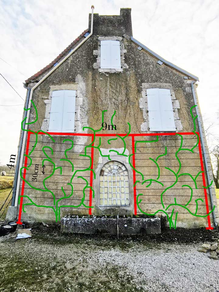 Pour le support j'avais imaginé des profile en U qui feront le cadre 4mX9m et qui repose sur le sol, et ensuite des files de fer tout les 30 cm. j'ai joint un dessin sur ma façade pour illustrer l'idée. Les U verticaux seront fixé a 15cm du mur via 3 gros pitons tout les 1m50. le profilé U du haut a l'horizontale a pour but de rigidifier la structure car je ne sais pas ce que peux peser une telle masse de roses( maintenant que j'y pense je pourrais le fixer un peu plus bas)