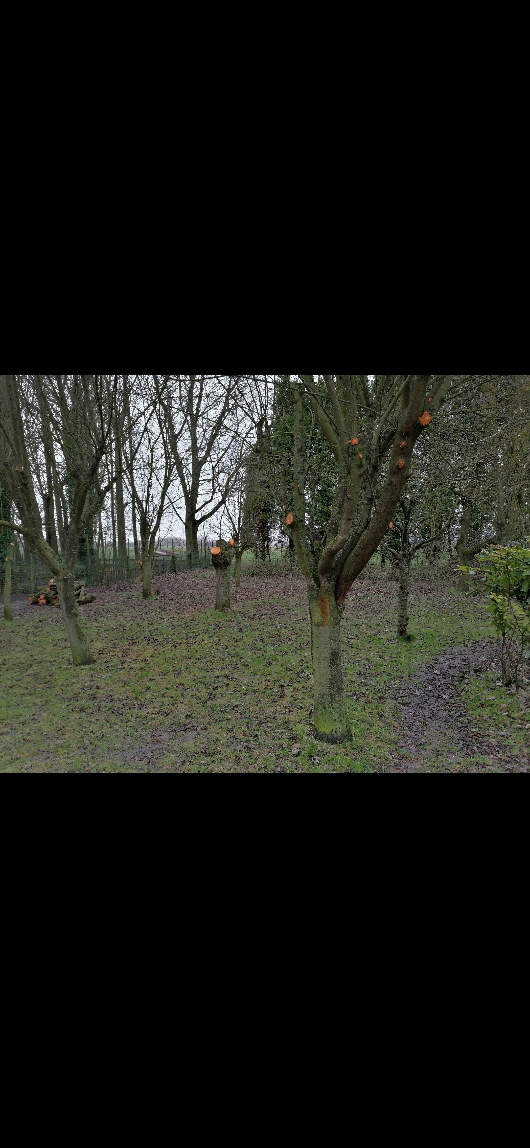 Concernant les pruniers, certains ont ete coupés severement, il ne reste que les branches charpentieres. Certaines branches charpentieres d'autres arbres ont ete coupees, deux ou trois, les plus basses, il reste les autres, encore nombreuses.