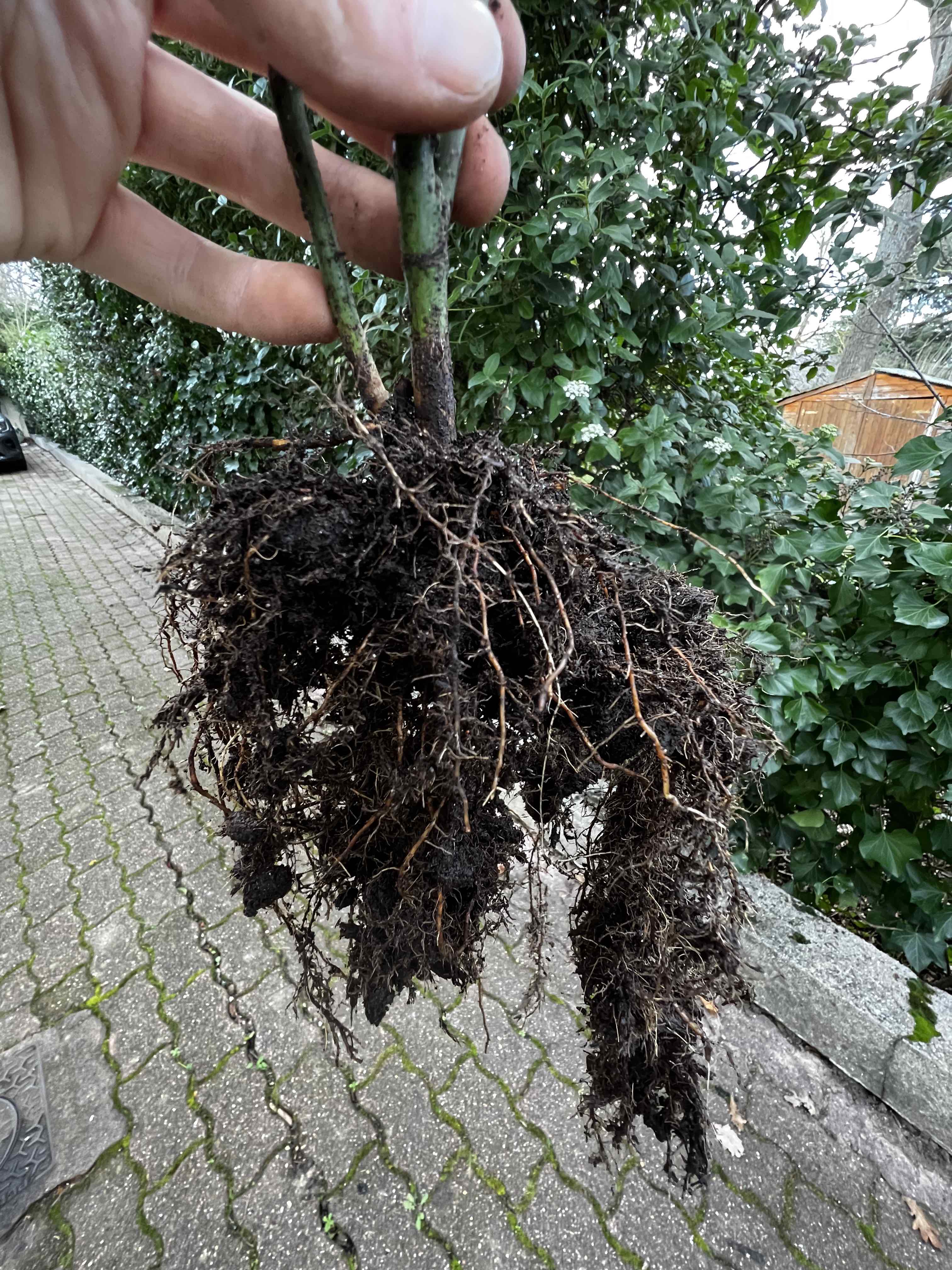 Sur tes photos, on voit une touffe de racines denses en haut, celles qui partent du collet, ce sont celles qui se sont créées lors du bouturage.