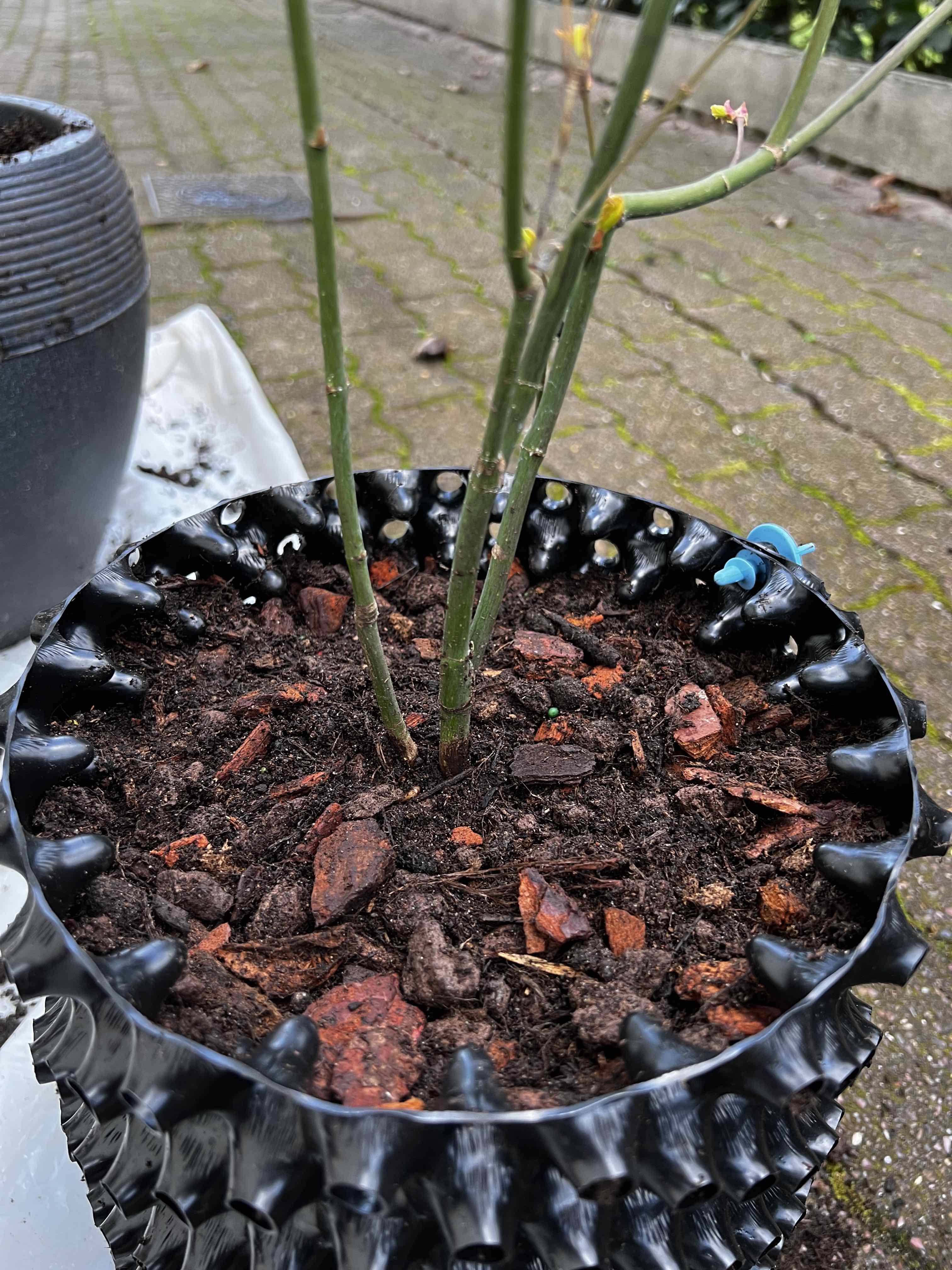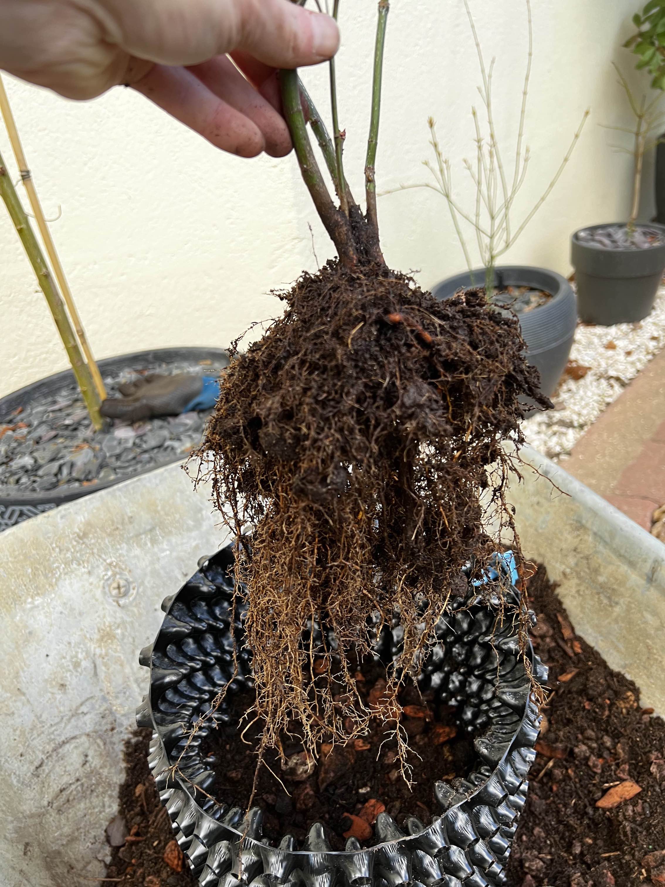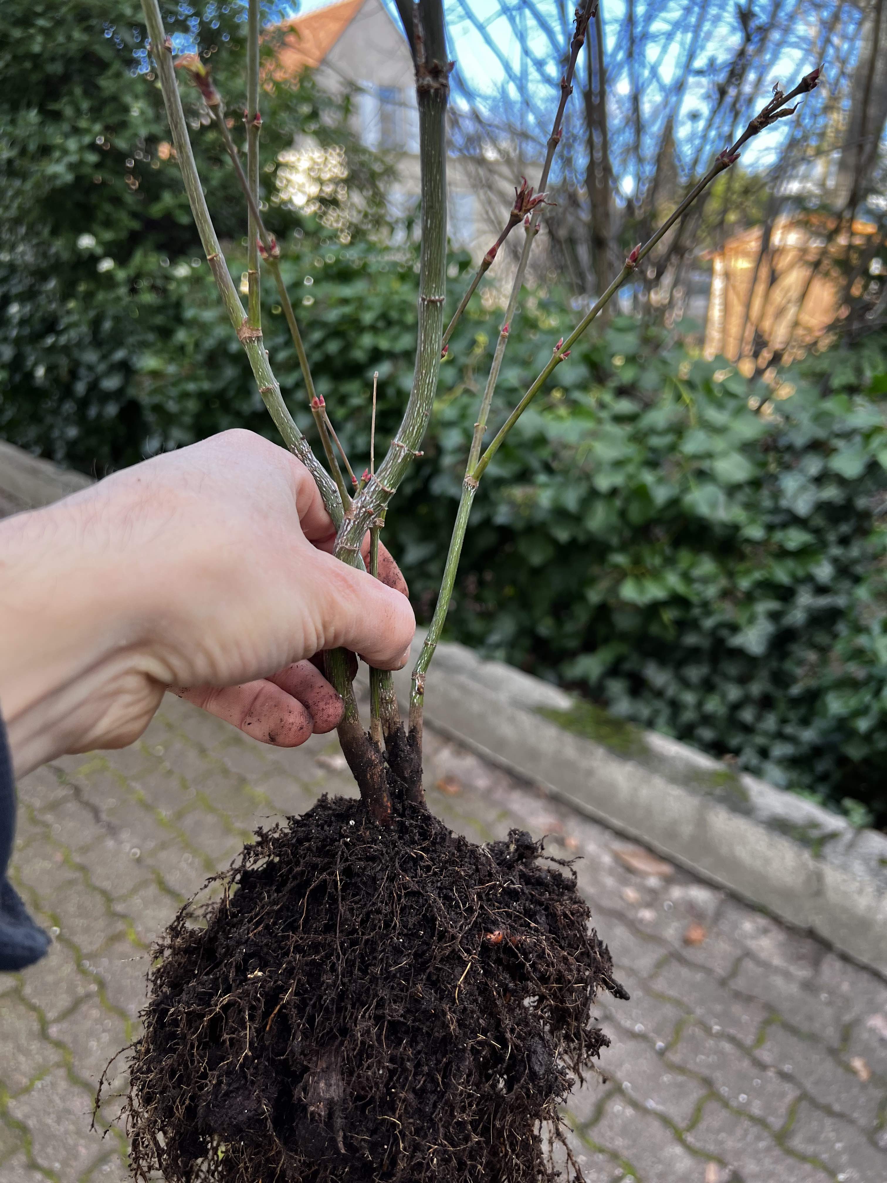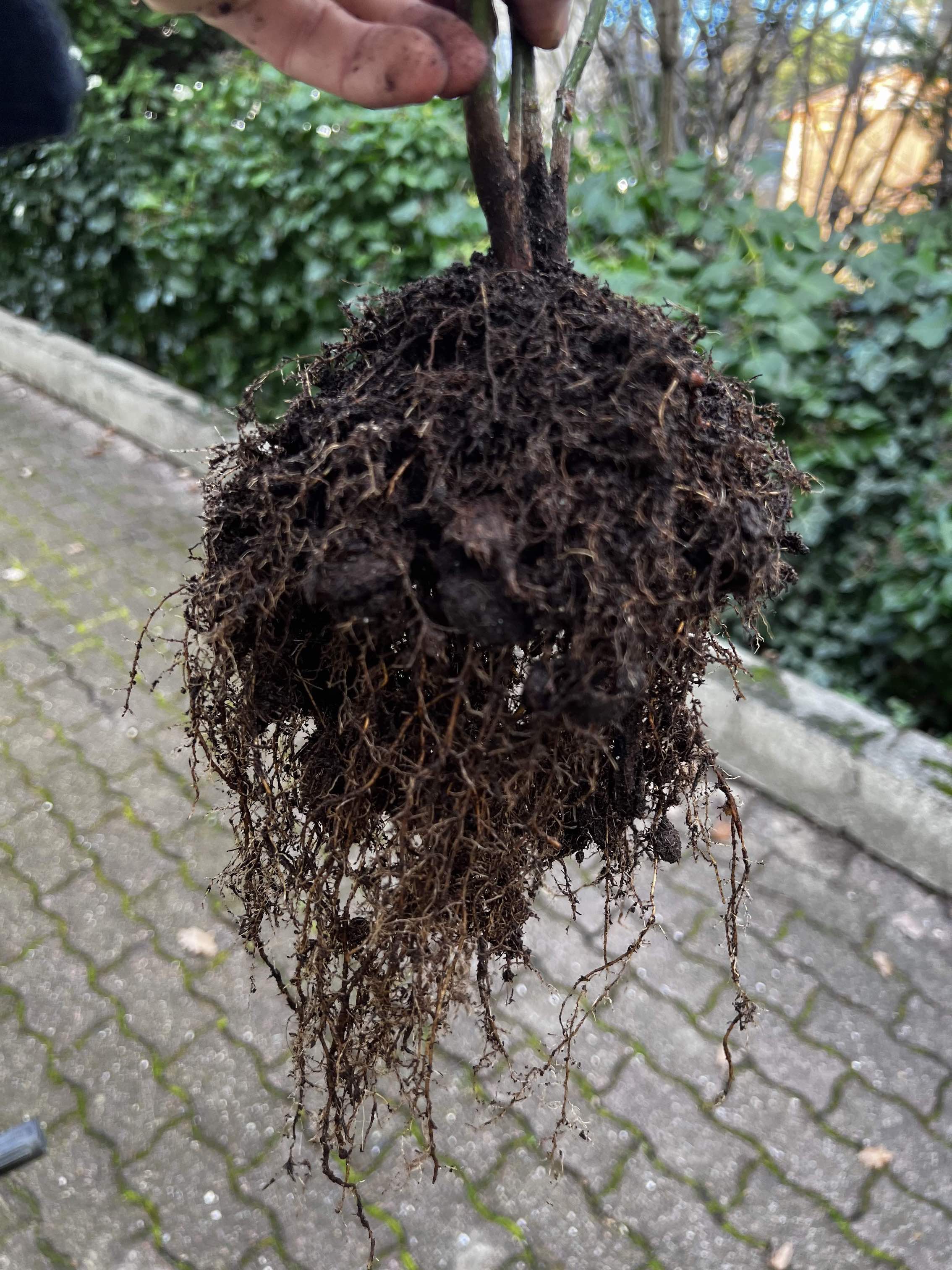Les racines avaient aussi poussĂ© vers le bas. Si je dois les Ă©taler Ă lâhorizontal, il faut que mon pot fasse 30 cm de plus en diamĂštre car les racines de lâacer Atropurpureum sont assez longues.