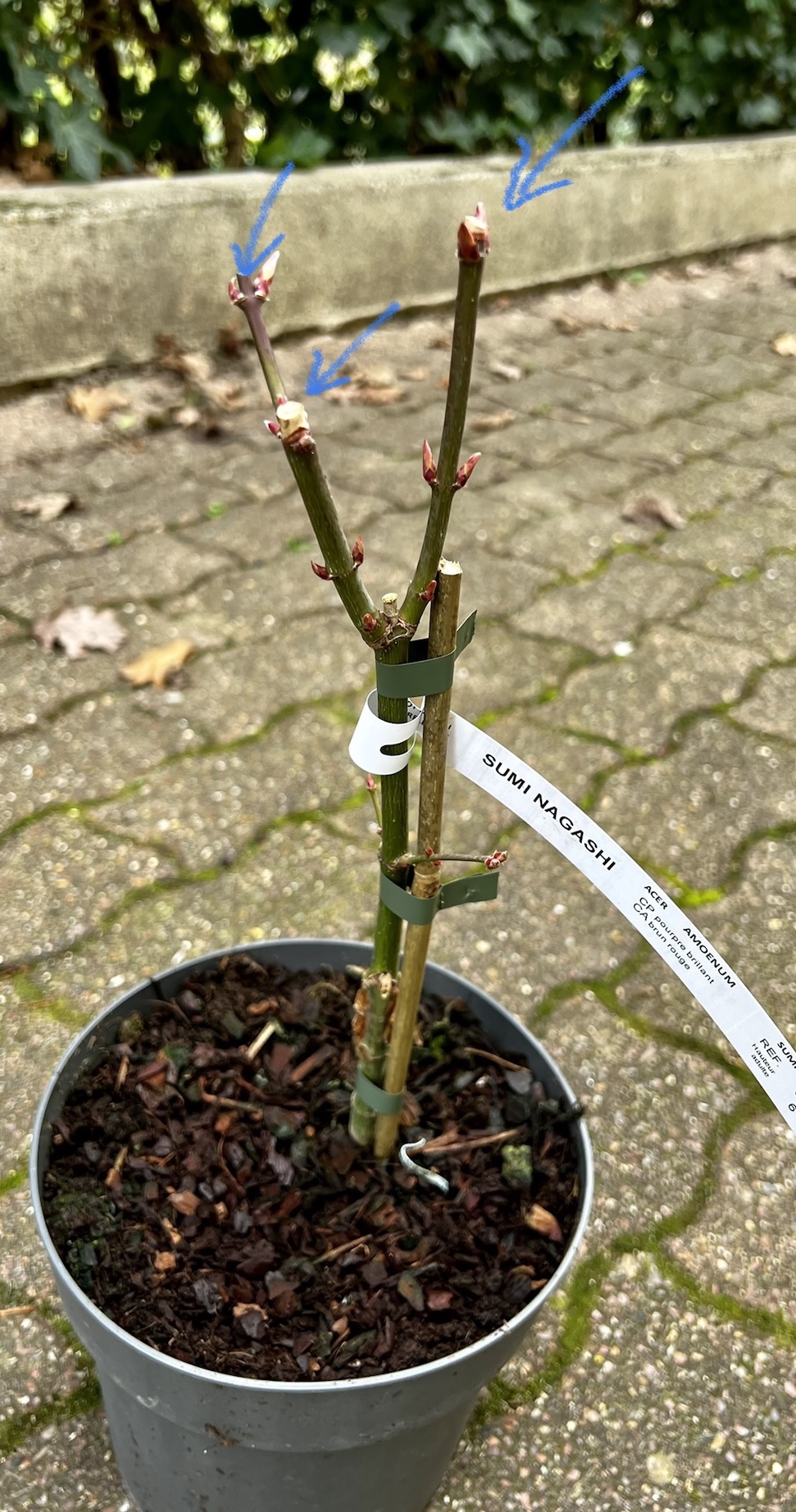 J'ai commandé ce petit érable sumi nagashi greffé de chez Maillot. Expédition/emaballage très pro. Autant pour les autres érables commandés Katsura et mikawa (voir les photos dans les autres posts), leurs hauteurs (50-60cm) me paraissent tout à fait correctes mais pour celui-ci il mesure tout juste 30cm (hors pot). Sur le site il est indiqué entre 30 et 60cm... Mais ce qui me chagrine aussi, c'est que toutes les grosses branches ont été coupées (voir mes flèches en bleu). Quel est votre avis? Pensez-vous qu'il ne va pas pousser en hauteur. Sur la fiche technique, il est dit entre 2 et 4 mètres et sur l'étiquette "hauteur adulte : 6". Merci