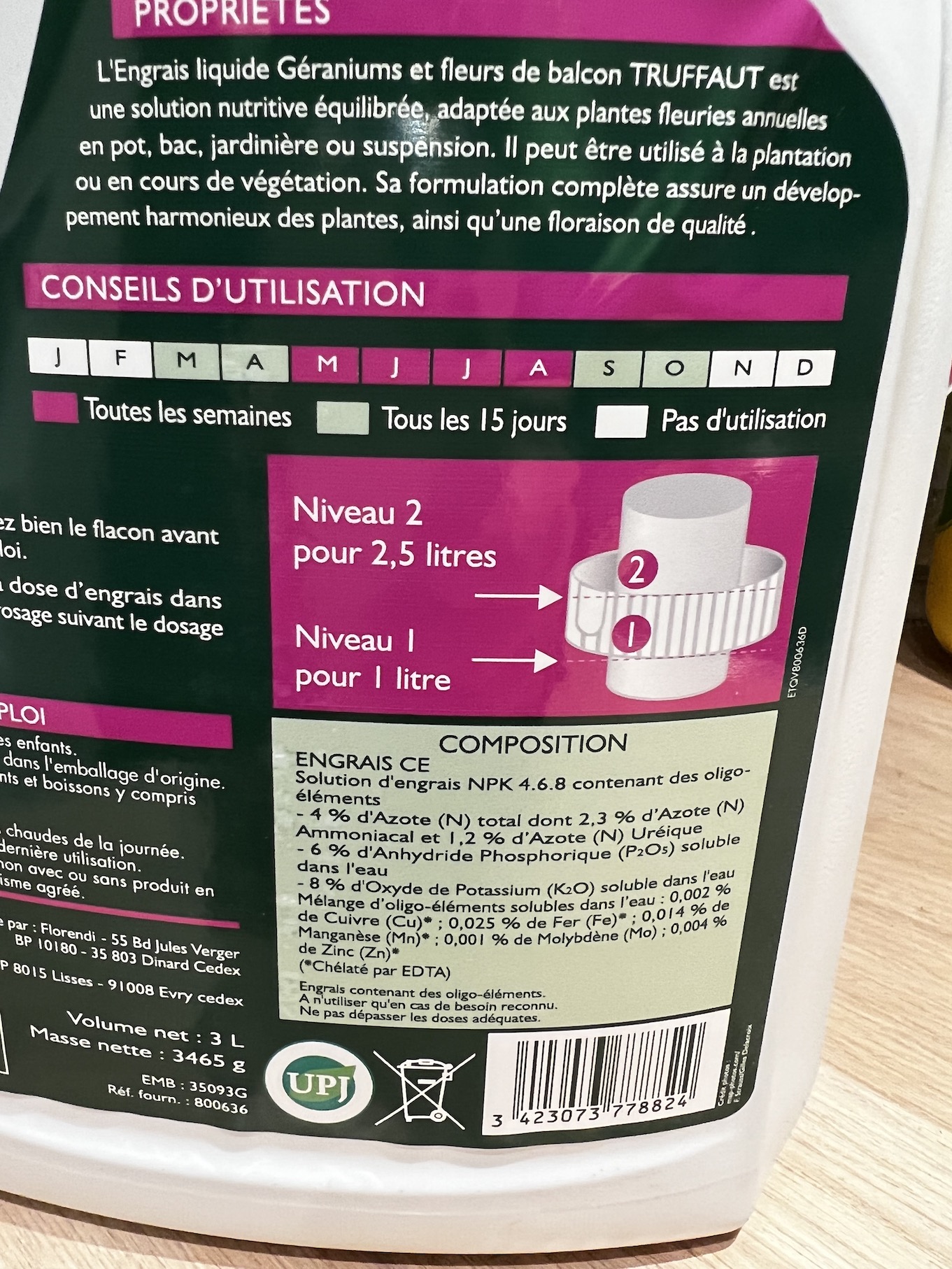 -C’est pour éviter la mésaventure d’un engrais inapproprié que je conseille à ceux qui ne veulent pas s’embêter, d’utiliser l’engrais géranium liquide avec oligoéléments. Là les dosages sont doux et équilibrés, aucun risque de brulure.