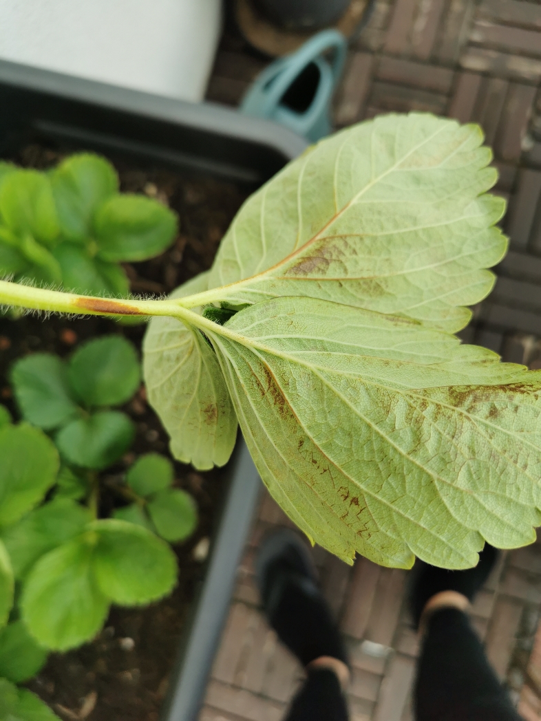 Depuis ce matin, tous mes plants de fraisiers sur mon balcon présentent des tâches sur les feuilles... Elles sont plutôt noires type goudron sur le dessus et marron sur le dessous (voir photos).