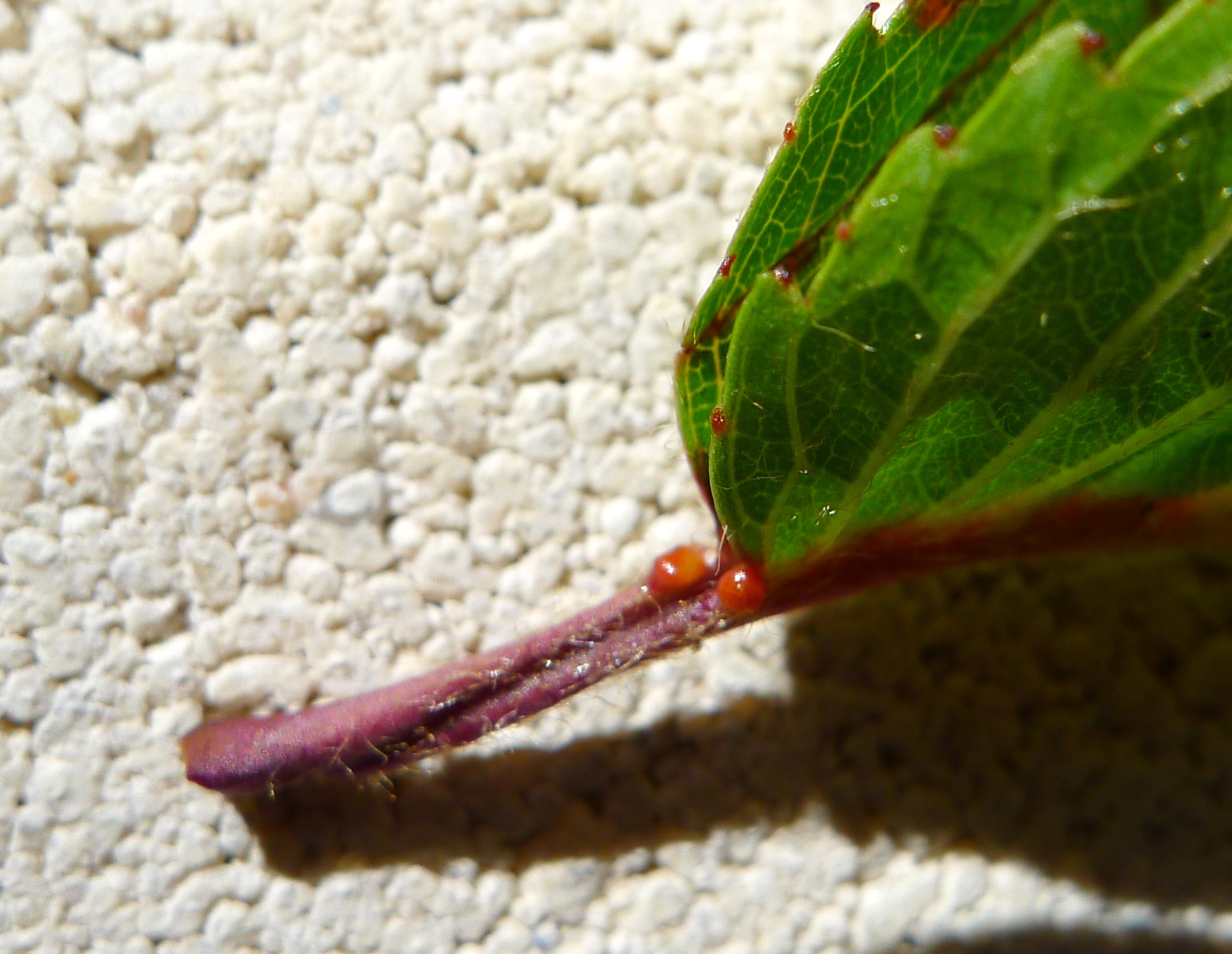 Mais une partie des nouvelles feuilles recommence à être grignotées, et sur ces feuilles je vois de petites boules rouges orangées. Visiblement c'est ça qui les grignote. Ca apparaît aussi sur certaines des tiges. J'ai enlevé toutes les tiges des feuilles grignotées, et aussi les nouvelles feuilles sur lesquelles j'ai pu voir ces boules (50% des nouvelles feuilles). J'ai bien tout inspecté, on dirait qu'il n'y en a plus.