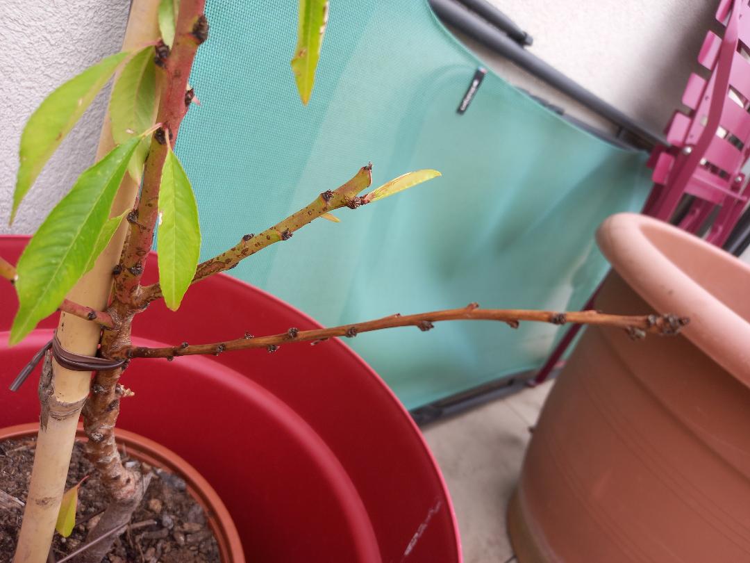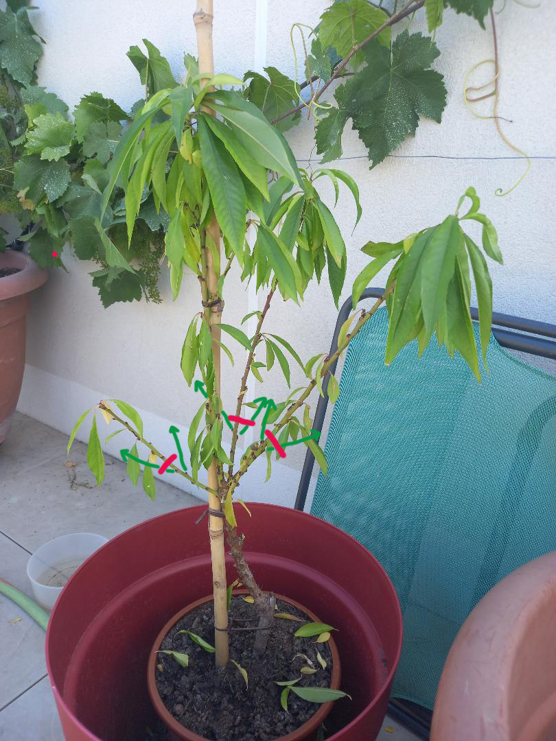 Il a 3 branches en bas du tronc. Je les trouve trop longues pour un arbre en pot et en formation. Il aurait fallu les raccourcir en mars pour obtenir 2 pousses sur chaque branche de façon à ce qu’il y ait fin 2022, 6 prolongements en bas de ton pêcher .
