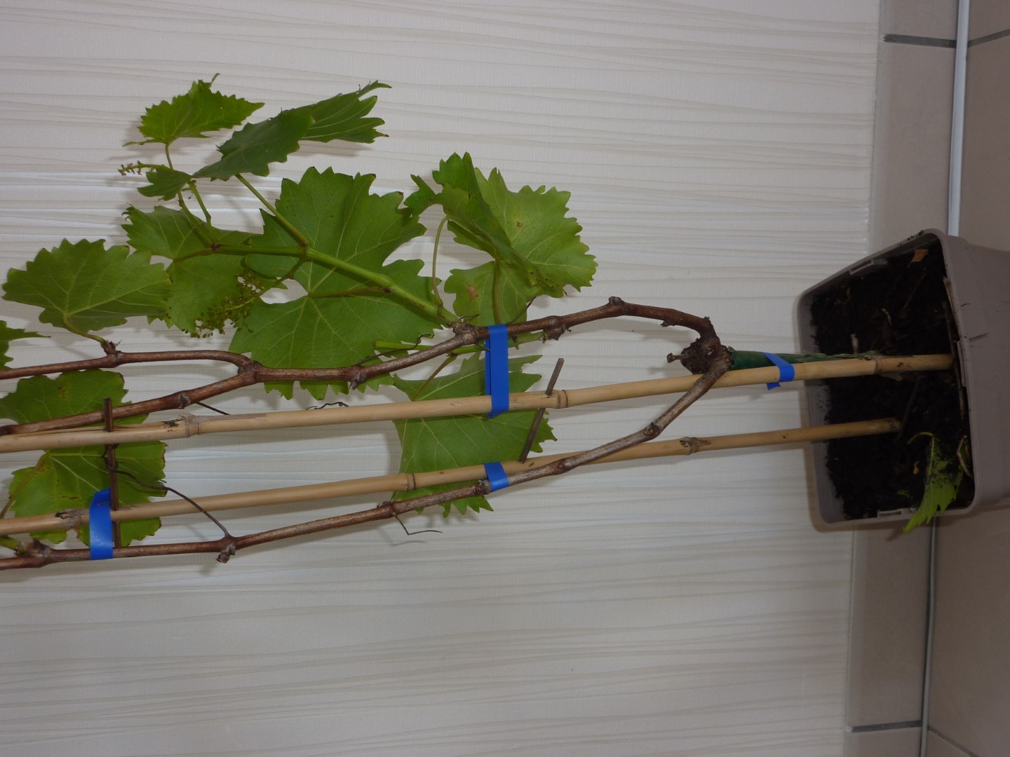 J'ai acheté hier un pied de vigne Muscat Bleu. Je ne suis pas sûre que le pied soit en très grande forme ou qu'il me donnera beaucoup de raisins cette année mais ce n'est pas grave... j'aimerais commencer à "l'apprivoiser" et à apprendre à l'entretenir pour que tout se passe bien l'an prochain.