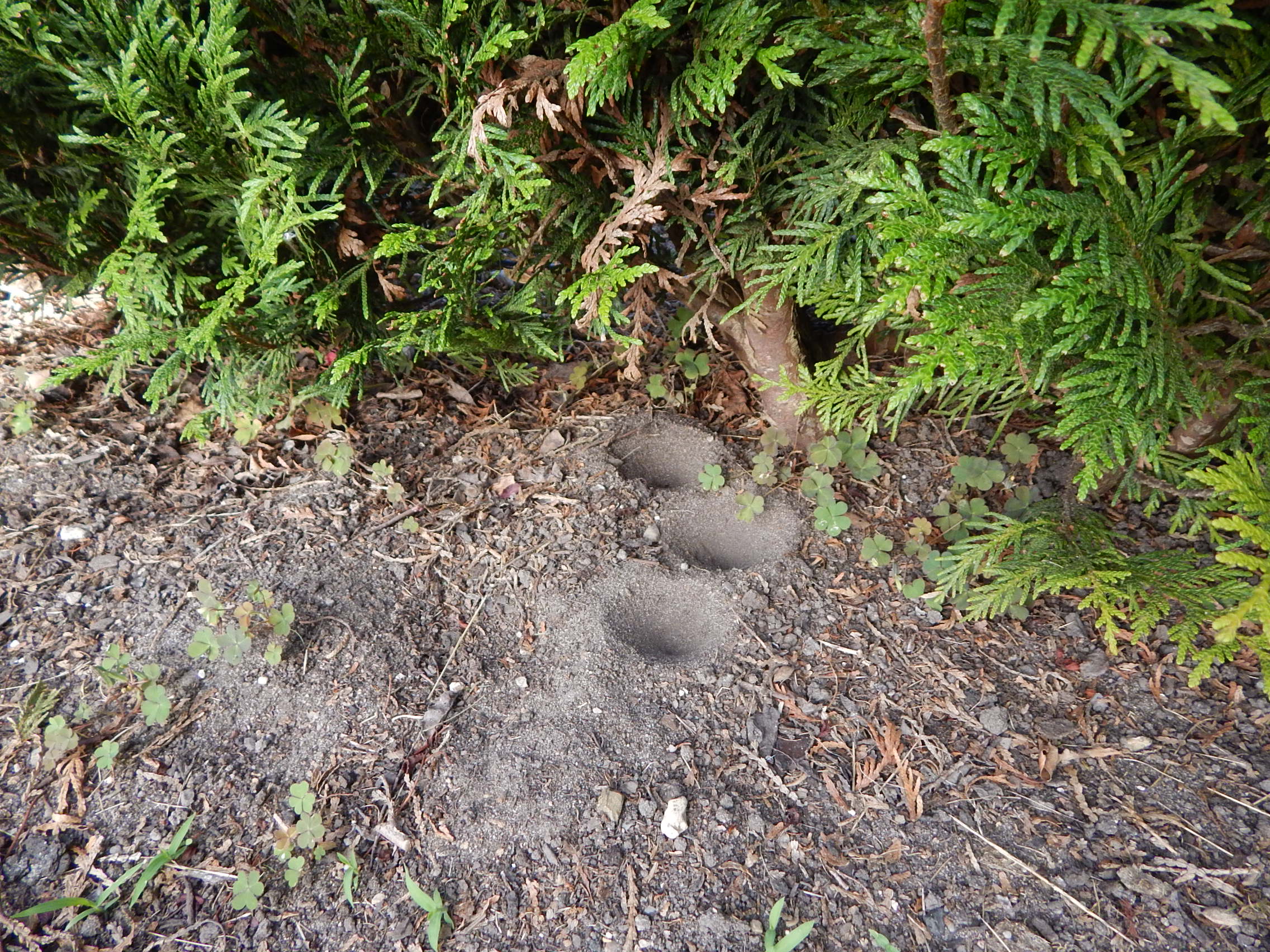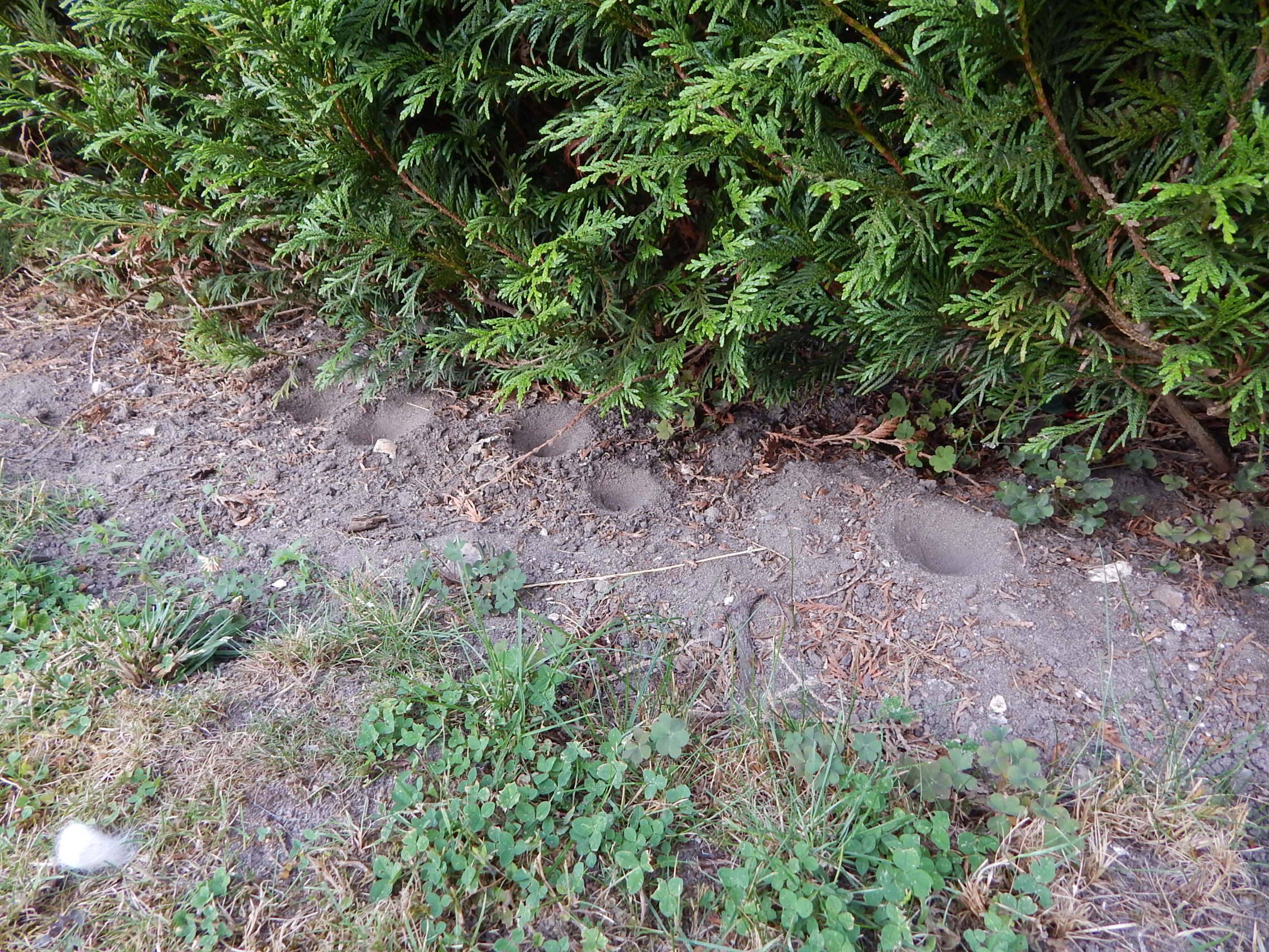 depuis 2 nuits, je suppose qu'un animal vient faire ces trous de formes parfaitement coniques dans la terre.