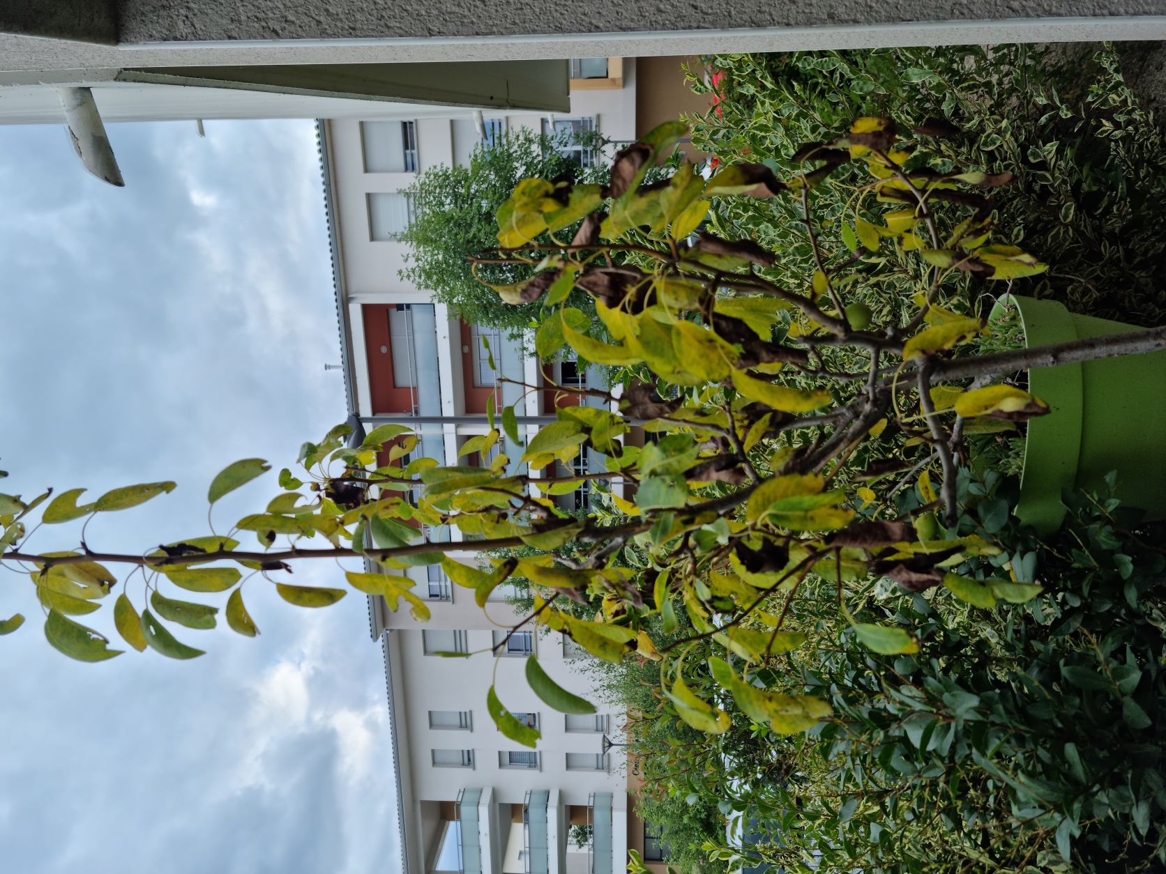 Ça m'évoquerait assez bien un excès d'eau... il est clair qu'un fruitier en pot, ce n'est pas l'idéal. J'ai eu un pommier en pot comme ça, sur une terrasse, il y a plus de 25 ans, et c'était une gageure que de le maintenir OK, en particulier au niveau de l'alimentation en eau : pas trop, mais pas trop peu non plus. Au bout de 2-3 ans je l'ai transplanté en pleine terre et il a beaucoup apprécié.